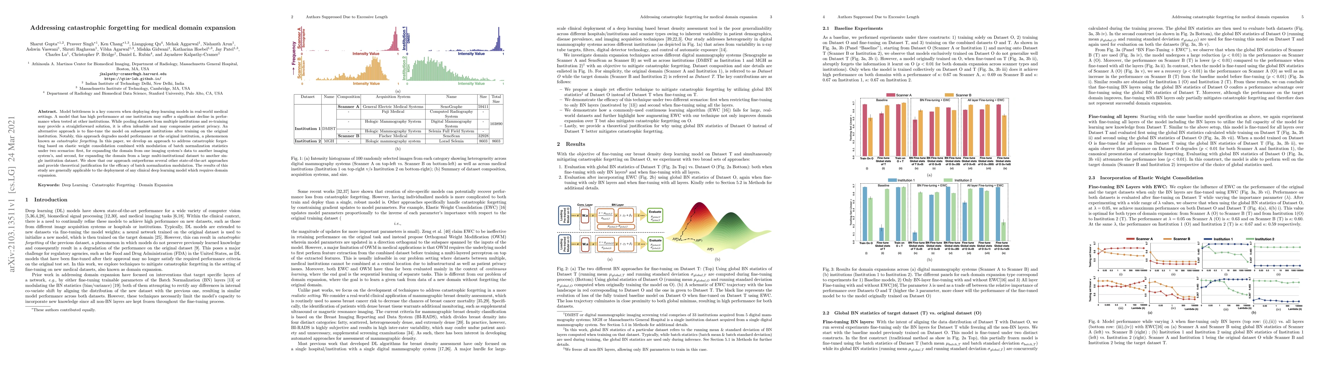 Model brittleness is a key concern when deploying deep learning models in real-world medical settings. A model that has high performance at one institution may suffer a significant decline in performance when tested at other institutions. While pooling datasets from multiple institutions and retraining may provide a straightforward solution, it is often infeasible and may compromise patient privacy. An alternative approach is to fine-tune the model on subsequent institutions after training on the original institution. Notably, this approach degrades model performance at the original institution, a phenomenon known as catastrophic forgetting. In this paper, we develop an approach to address catastrophic forget-ting based on elastic weight consolidation combined with modulation of batch normalization statistics under two scenarios: first, for expanding the domain from one imaging system's data to another imaging system's, and second, for expanding the domain from a large multi-institutional dataset to another single institution dataset. We show that our approach outperforms several other state-of-the-art approaches and provide theoretical justification for the efficacy of batch normalization modulation. The results of this study are generally applicable to the deployment of any clinical deep learning model which requires domain expansion.