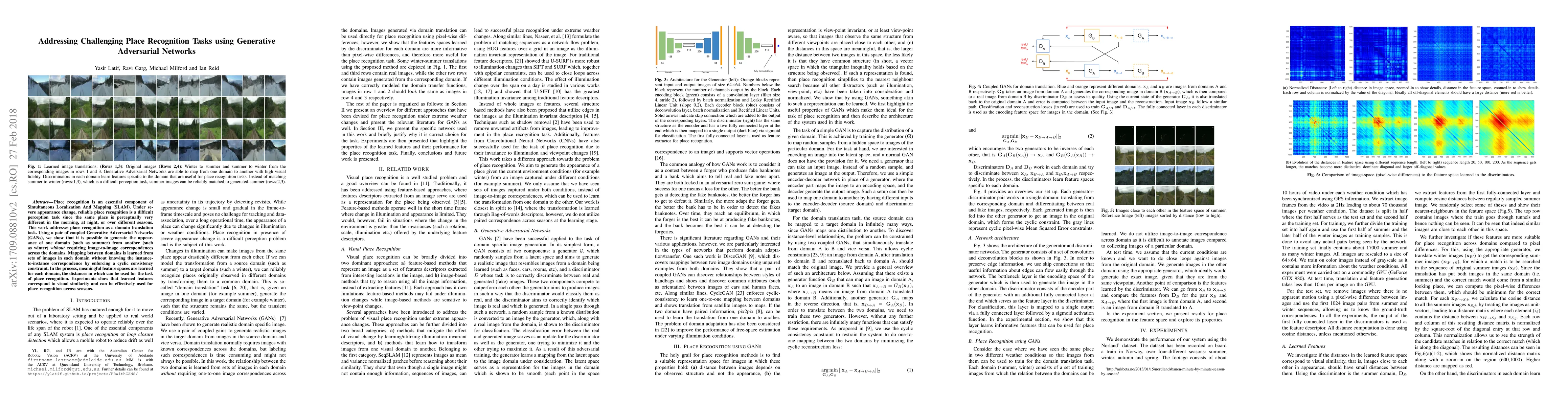 This research proposes using Generative Adversarial Networks (GANs) to tackle challenging place recognition tasks by translating appearance across different domains (e.g., seasons) without requiring image-to-image correspondences, enabling effective place recognition under severe appearance changes.