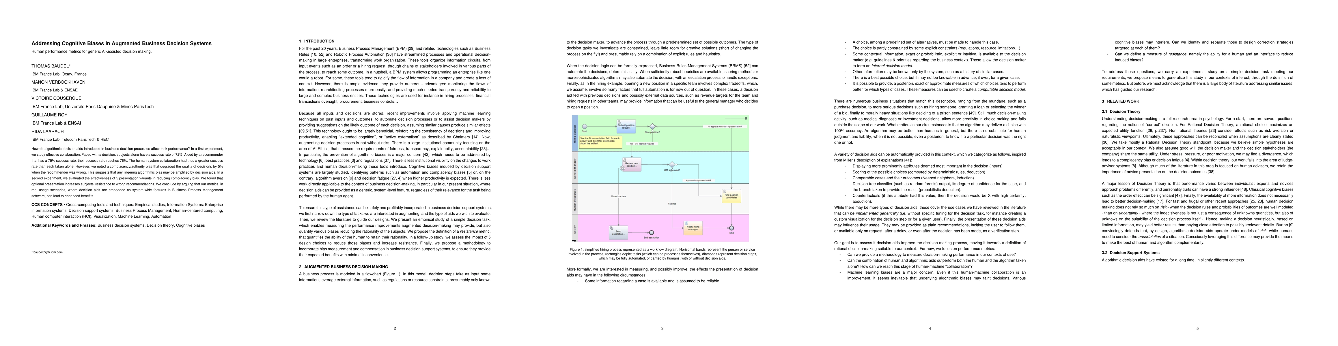 How do algorithmic decision aids introduced in business decision processes affect task performance? In a first experiment, we study effective collaboration. Faced with a decision, subjects alone have a success rate of 72%; Aided by a recommender that has a 75% success rate, their success rate reaches 76%. The human-system collaboration had thus a greater success rate than each taken alone. However, we noted a complacency/authority bias that degraded the quality of decisions by 5% when the recommender was wrong. This suggests that any lingering algorithmic bias may be amplified by decision aids. In a second experiment, we evaluated the effectiveness of 5 presentation variants in reducing complacency bias. We found that optional presentation increases subjects' resistance to wrong recommendations. We conclude by arguing that our metrics, in real usage scenarios, where decision aids are embedded as system-wide features in Business Process Management software, can lead to enhanced benefits.