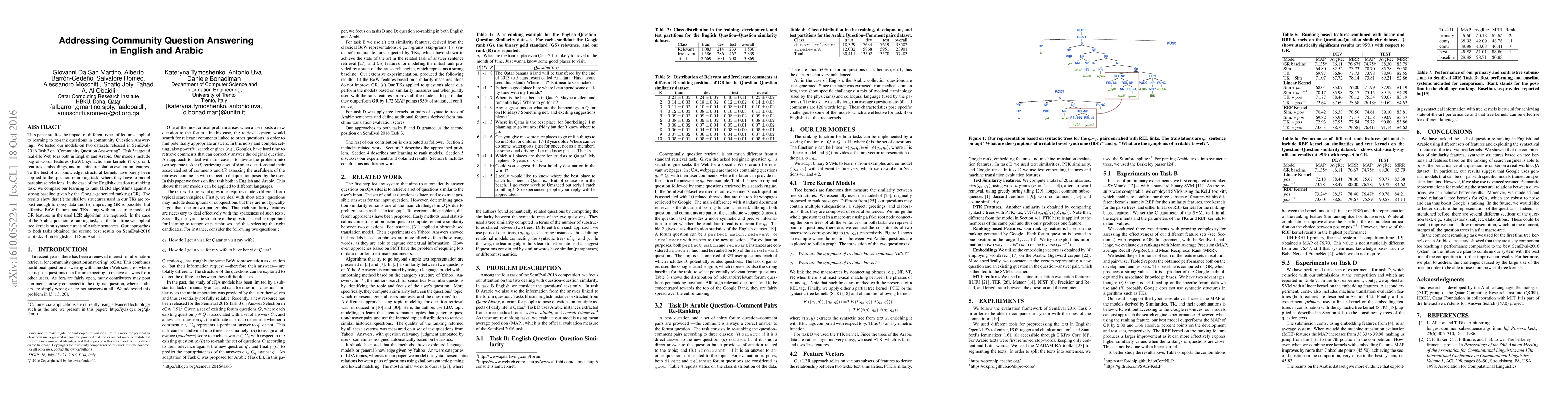 This paper studies the impact of different types of features applied to learning to re-rank questions in community Question Answering. We tested our models on two datasets released in SemEval-2016 Task 3 on "Community Question Answering". Task 3 targeted real-life Web fora both in English and Arabic. Our models include bag-of-words features (BoW), syntactic tree kernels (TKs), rank features, embeddings, and machine translation evaluation features. To the best of our knowledge, structural kernels have barely been applied to the question reranking task, where they have to model paraphrase relations. In the case of the English question re-ranking task, we compare our learning to rank (L2R) algorithms against a strong baseline given by the Google-generated ranking (GR). The results show that i) the shallow structures used in our TKs are robust enough to noisy data and ii) improving GR is possible, but effective BoW features and TKs along with an accurate model of GR features in the used L2R algorithm are required. In the case of the Arabic question re-ranking task, for the first time we applied tree kernels on syntactic trees of Arabic sentences. Our approaches to both tasks obtained the second best results on SemEval-2016 subtasks B on English and D on Arabic.