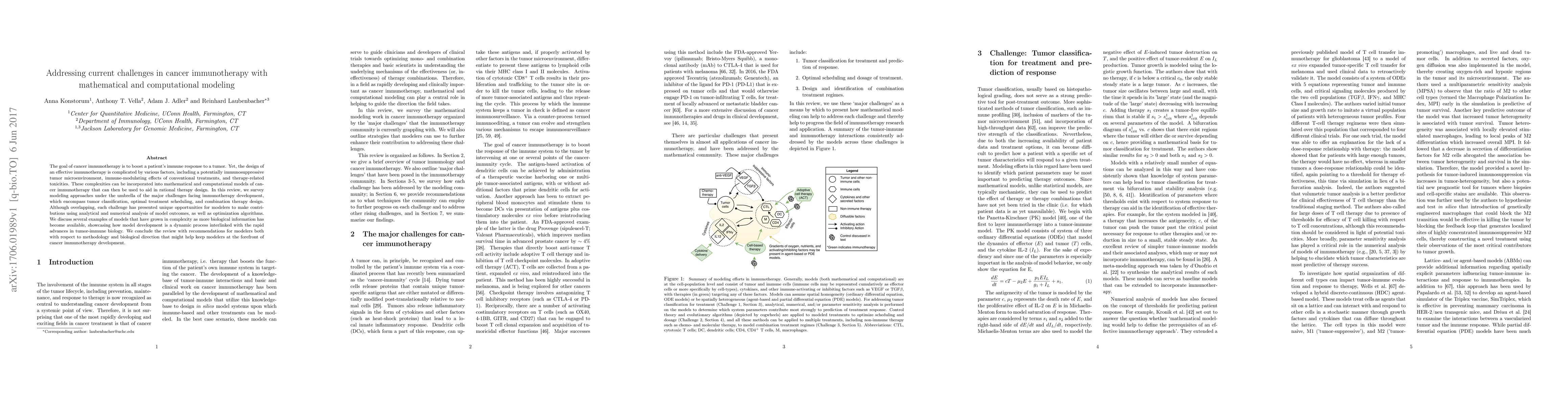 This paper reviews mathematical and computational modeling approaches to address challenges in cancer immunotherapy, including tumor classification, treatment scheduling, and combination therapy. It highlights the dynamic interplay between model development and advances in tumor-immune biology, offering recommendations for future modeling efforts.