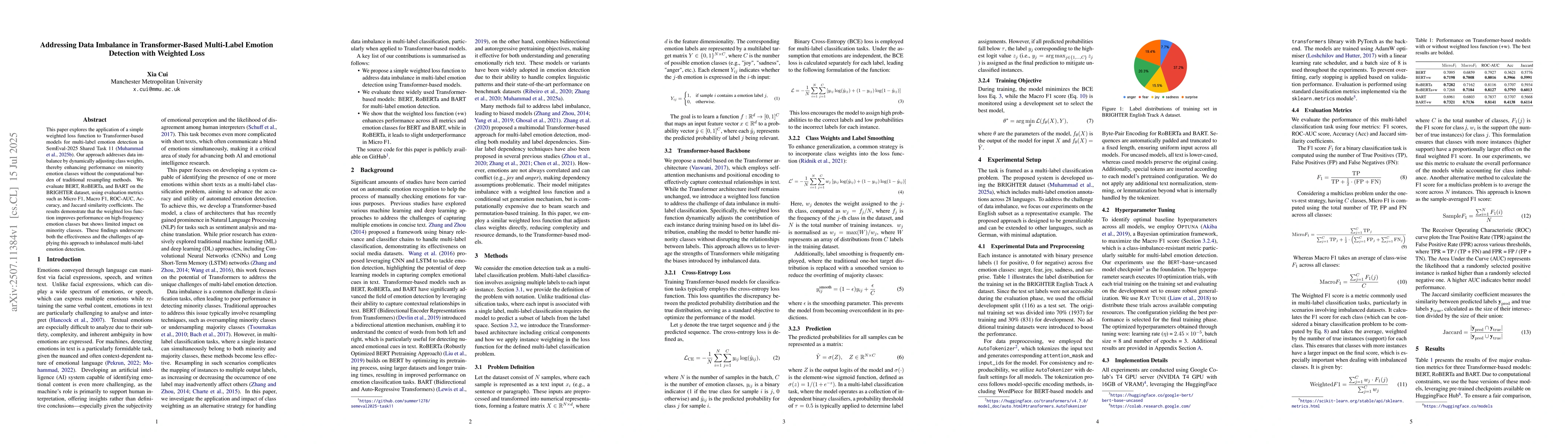 This paper explores the application of a simple weighted loss function to Transformer-based models for multi-label emotion detection in SemEval-2025 Shared Task 11. Our approach addresses data imbalance by dynamically adjusting class weights, thereby enhancing performance on minority emotion classes without the computational burden of traditional resampling methods. We evaluate BERT, RoBERTa, and BART on the BRIGHTER dataset, using evaluation metrics such as Micro F1, Macro F1, ROC-AUC, Accuracy, and Jaccard similarity coefficients. The results demonstrate that the weighted loss function improves performance on high-frequency emotion classes but shows limited impact on minority classes. These findings underscore both the effectiveness and the challenges of applying this approach to imbalanced multi-label emotion detection.
