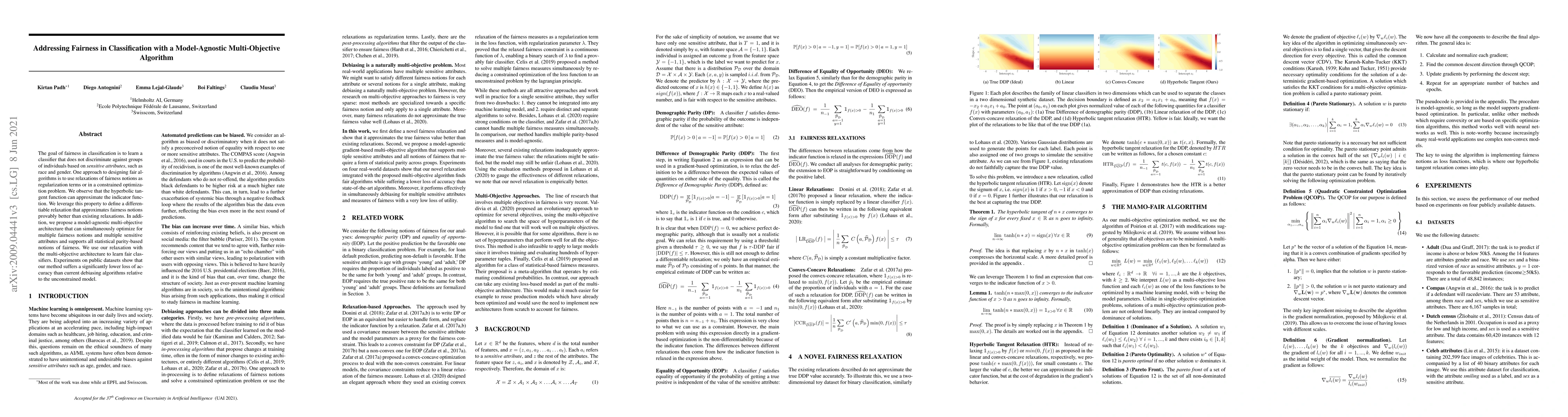 This paper proposes a model-agnostic multi-objective algorithm to optimize fairness in classification, using a differentiable relaxation based on the hyperbolic tangent function. The method achieves better approximation of fairness notions and significantly lower accuracy loss compared to existing debiasing algorithms.