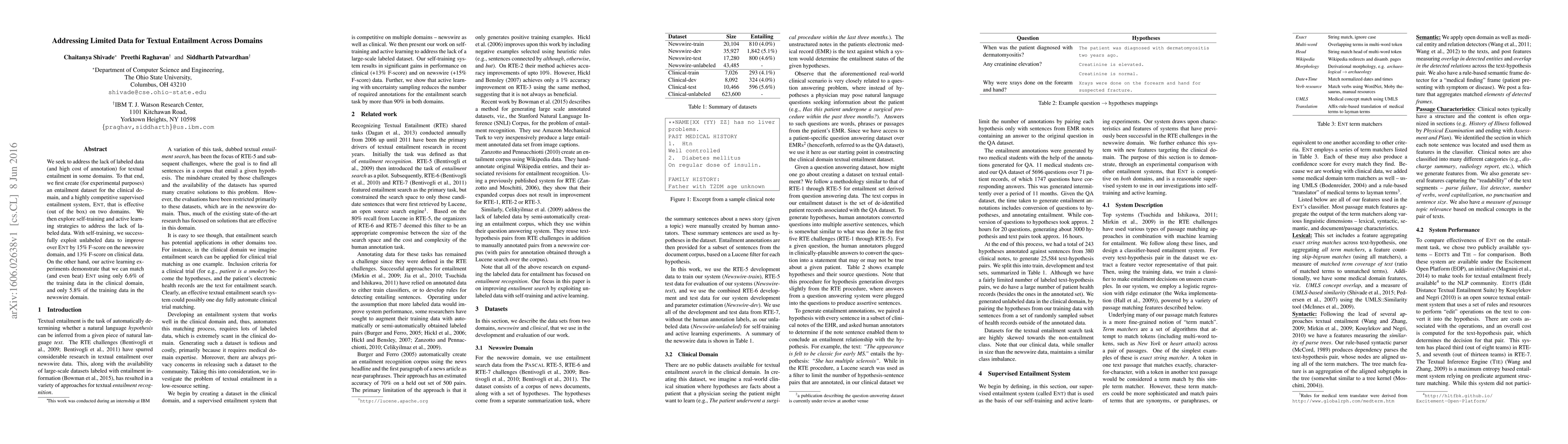 This paper addresses limited data for textual entailment across domains by using self-training and active learning strategies to improve the performance of a supervised system, achieving significant gains on both clinical and newswire domains.