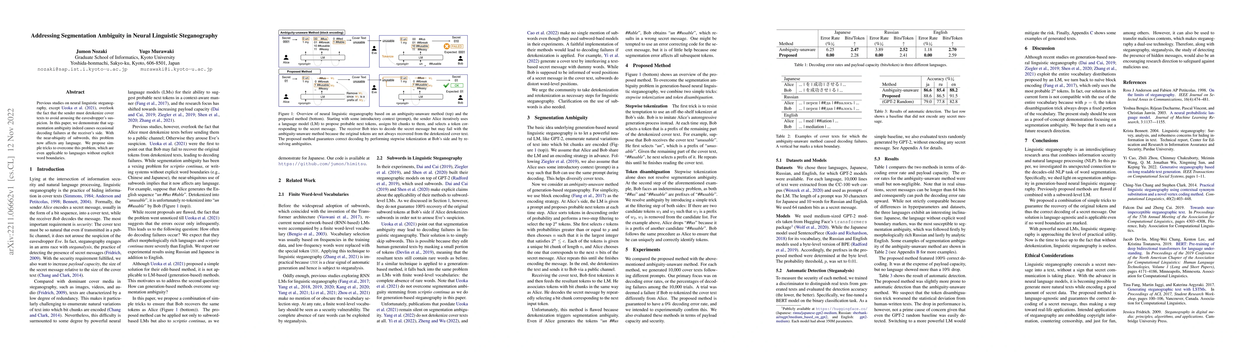This paper addresses the issue of segmentation ambiguity in neural linguistic steganography, showing that it leads to decoding failures. The authors propose simple methods to mitigate this problem, applicable even to languages without clear word boundaries.