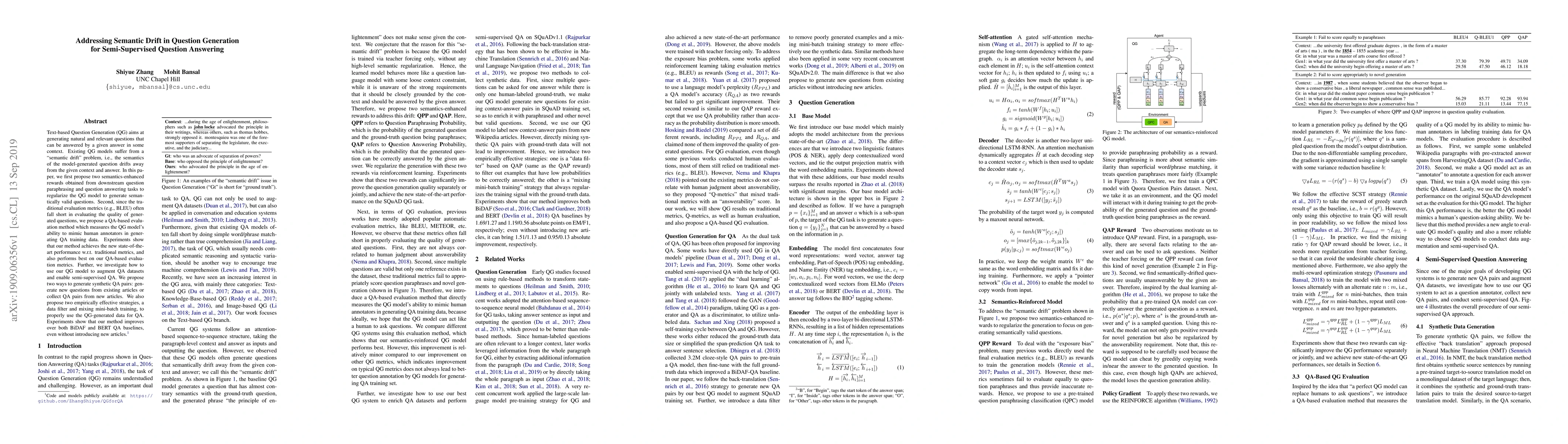 This paper proposes methods to address semantic drift in Text-based Question Generation, introducing semantics-enhanced rewards and a QA-based evaluation method. It also explores augmenting QA datasets using QG models, demonstrating improved performance over existing QA baselines.