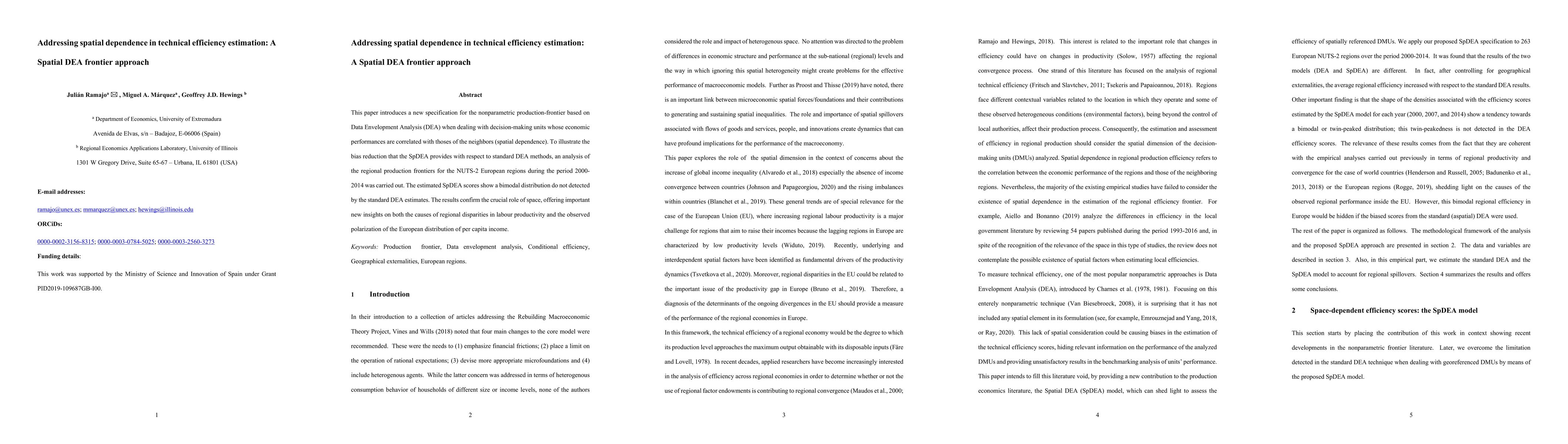 This paper introduces a new specification for the nonparametric production-frontier based on Data Envelopment Analysis (DEA) when dealing with decision-making units whose economic performances are correlated with those of the neighbors (spatial dependence). To illustrate the bias reduction that the SpDEA provides with respect to standard DEA methods, an analysis of the regional production frontiers for the NUTS-2 European regions during the period 2000-2014 was carried out. The estimated SpDEA scores show a bimodal distribution do not detected by the standard DEA estimates. The results confirm the crucial role of space, offering important new insights on both the causes of regional disparities in labour productivity and the observed polarization of the European distribution of per capita income.