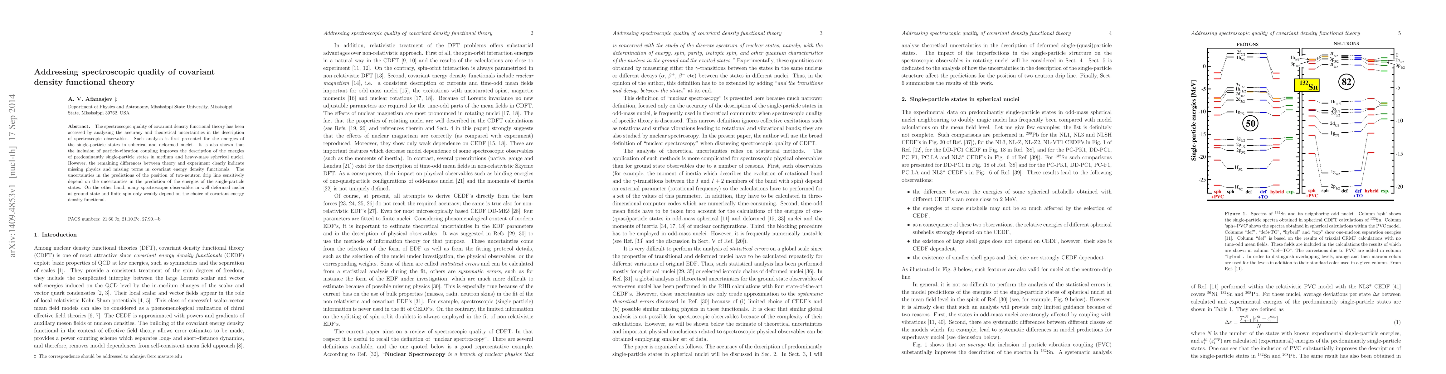 The spectroscopic quality of covariant density functional theory has been accessed by analyzing the accuracy and theoretical uncertainties in the description of spectroscopic observables. Such analysis is first presented for the energies of the single-particle states in spherical and deformed nuclei. It is also shown that the inclusion of particle-vibration coupling improves the description of the energies of predominantly single-particle states in medium and heavy-mass spherical nuclei. However, the remaining differences between theory and experiment clearly indicate missing physics and missing terms in covariant energy density functionals. The uncertainties in the predictions of the position of two-neutron drip line sensitively depend on the uncertainties in the prediction of the energies of the single-particle states. On the other hand, many spectroscopic observables in well deformed nuclei at ground state and finite spin only weakly depend on the choice of covariant energy density functional.