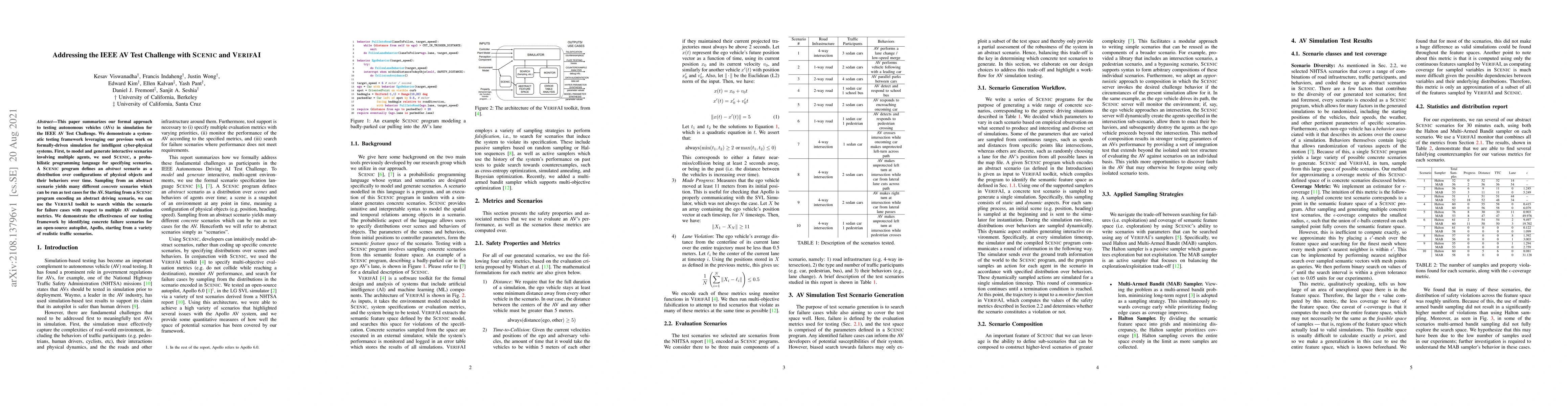 This paper summarizes our formal approach to testing autonomous vehicles (AVs) in simulation for the IEEE AV Test Challenge. We demonstrate a systematic testing framework leveraging our previous work on formally-driven simulation for intelligent cyber-physical systems. First, to model and generate interactive scenarios involving multiple agents, we used Scenic, a probabilistic programming language for specifying scenarios. A Scenic program defines an abstract scenario as a distribution over configurations of physical objects and their behaviors over time. Sampling from an abstract scenario yields many different concrete scenarios which can be run as test cases for the AV. Starting from a Scenic program encoding an abstract driving scenario, we can use the VerifAI toolkit to search within the scenario for failure cases with respect to multiple AV evaluation metrics. We demonstrate the effectiveness of our testing framework by identifying concrete failure scenarios for an open-source autopilot, Apollo, starting from a variety of realistic traffic scenarios.
