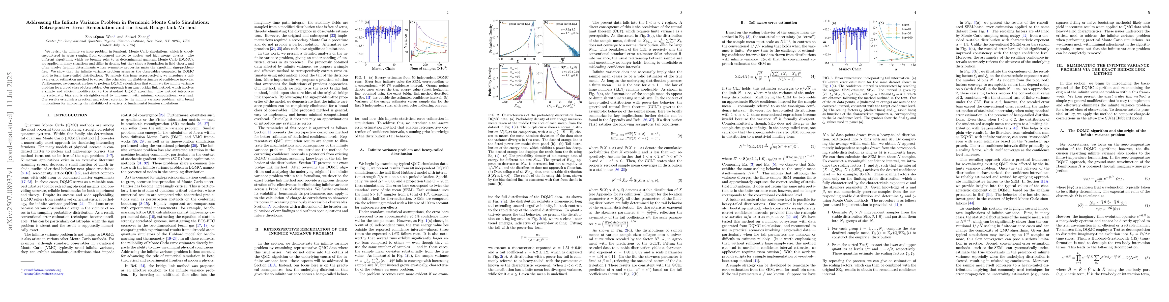 We revisit the infinite variance problem in fermionic Monte Carlo simulations, which is widely encountered in areas ranging from condensed matter to nuclear and high-energy physics. The different algorithms, which we broadly refer to as determinantal quantum Monte Carlo (DQMC), are applied in many situations and differ in details, but they share a foundation in field theory, and often involve fermion determinants whose symmetry properties make the algorithm sign-problem-free. We show that the infinite variance problem arises as the observables computed in DQMC tend to form heavy-tailed distributions. To remedy this issue retrospectively, we introduce a tail-aware error estimation method to correct the otherwise unreliable estimates of confidence intervals. Furthermore, we demonstrate how to perform DQMC calculations that eliminate the infinite variance problem for a broad class of observables. Our approach is an exact bridge link method, which involves a simple and efficient modification to the standard DQMC algorithm. The method introduces no systematic bias and is straightforward to implement with minimal computational overhead. Our results establish a practical and robust solution to the infinite variance problem, with broad implications for improving the reliability of a variety of fundamental fermion simulations.
