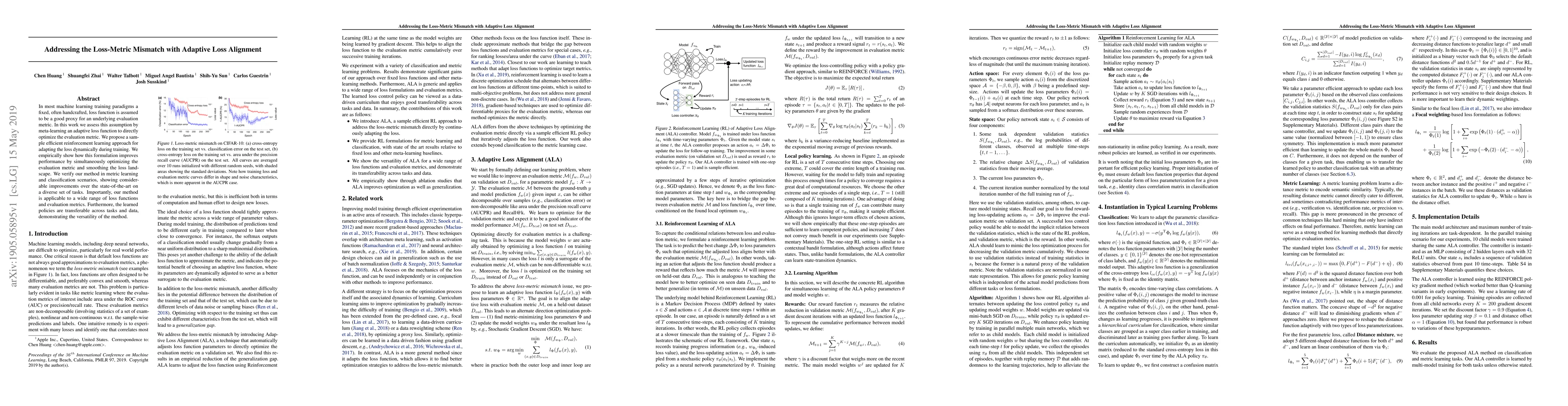 This paper proposes a meta-learning approach to adaptively align loss functions with evaluation metrics, improving performance by optimizing the metric directly. The method uses sample-efficient reinforcement learning to dynamically adjust the loss during training, demonstrating significant improvements over state-of-the-art methods across various tasks.