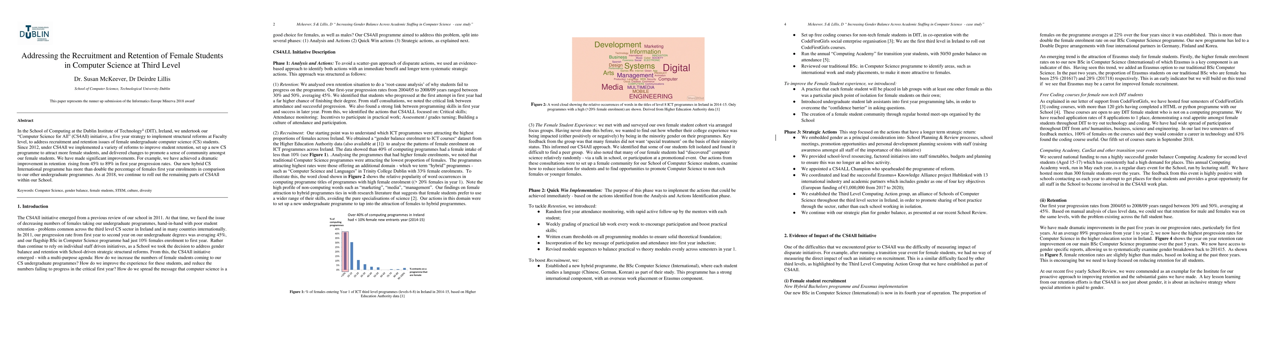 The Dublin Institute of Technology's CS4All initiative implemented structural reforms to improve female recruitment and retention in computer science, achieving a significant rise in first-year progression rates from 45% to 89% and doubling female enrollments in a new hybrid CS program. The initiative continues to expand its reforms to further enhance female participation.
