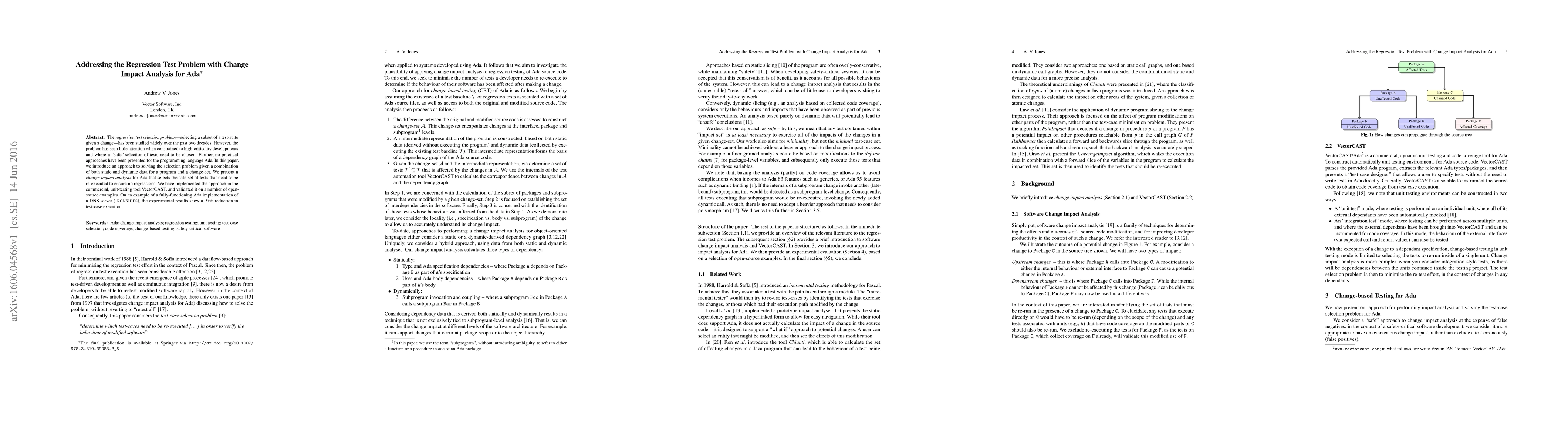The regression test selection problem--selecting a subset of a test-suite given a change--has been studied widely over the past two decades. However, the problem has seen little attention when constrained to high-criticality developments and where a "safe" selection of tests need to be chosen. Further, no practical approaches have been presented for the programming language Ada. In this paper, we introduce an approach to solving the selection problem given a combination of both static and dynamic data for a program and a change-set. We present a change impact analysis for Ada that selects the safe set of tests that need to be re-executed to ensure no regressions. We have implemented the approach in the commercial, unit-testing tool VectorCAST, and validated it on a number of open-source examples. On an example of a fully-functioning Ada implementation of a DNS server (IRONSIDES), the experimental results show a 97% reduction in test-case execution.