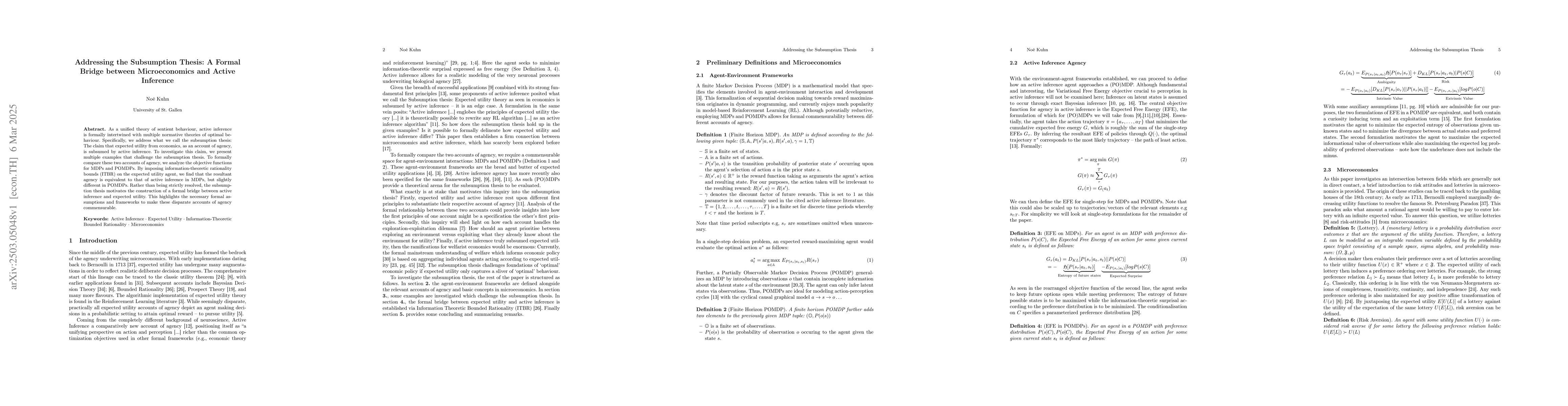 The paper presents a formal bridge between microeconomics, specifically expected utility theory, and active inference using Markov Decision Processes (MDPs) and Partially Observable Markov Decision Processes (POMDPs). It investigates the subsumption thesis, which claims that expected utility is subsumed by active inference.