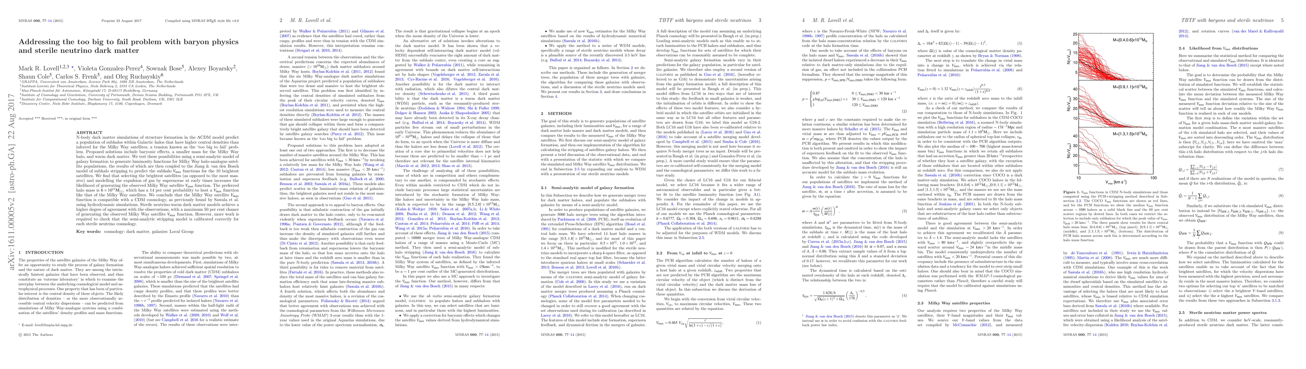 This paper investigates the "too big to fail" problem in dark matter simulations by exploring baryonic effects, smaller Milky Way halo masses, and sterile neutrino dark matter. It finds that modeling early gas expulsion by supernovae increases the likelihood of matching observed Milky Way satellite velocities, while sterile neutrino dark matter models show a higher degree of agreement but require further validation.