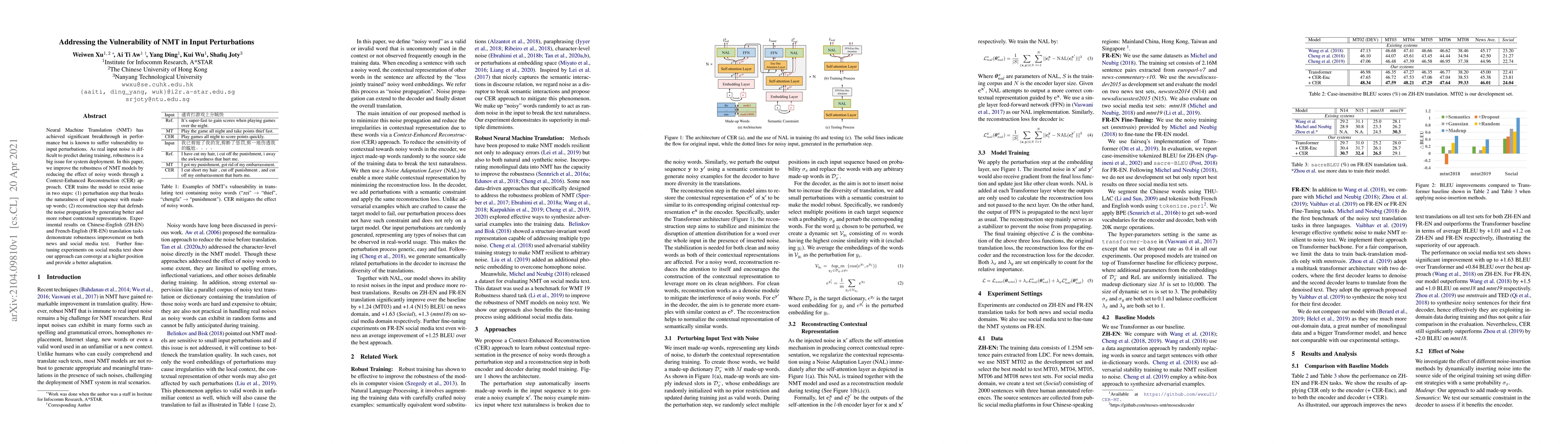 This paper improves NMT model robustness to input perturbations by training a Context-Enhanced Reconstruction approach that breaks and then defends against noisy sequences, demonstrating improved performance on Chinese-English and French-English translation tasks.