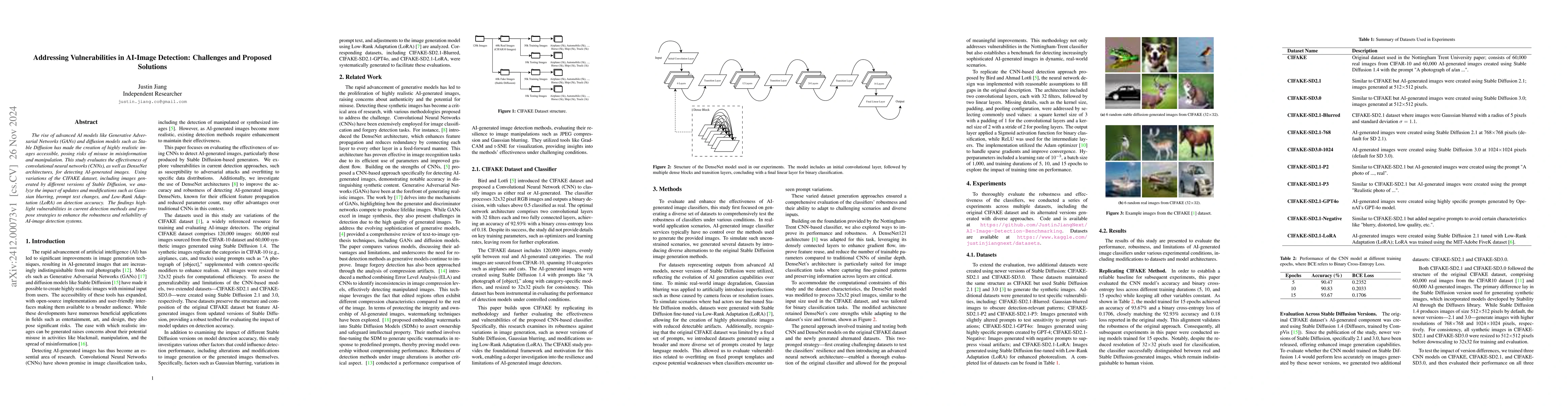 The rise of advanced AI models like Generative Adversarial Networks (GANs) and diffusion models such as Stable Diffusion has made the creation of highly realistic images accessible, posing risks of misuse in misinformation and manipulation. This study evaluates the effectiveness of convolutional neural networks (CNNs), as well as DenseNet architectures, for detecting AI-generated images. Using variations of the CIFAKE dataset, including images generated by different versions of Stable Diffusion, we analyze the impact of updates and modifications such as Gaussian blurring, prompt text changes, and Low-Rank Adaptation (LoRA) on detection accuracy. The findings highlight vulnerabilities in current detection methods and propose strategies to enhance the robustness and reliability of AI-image detection systems.