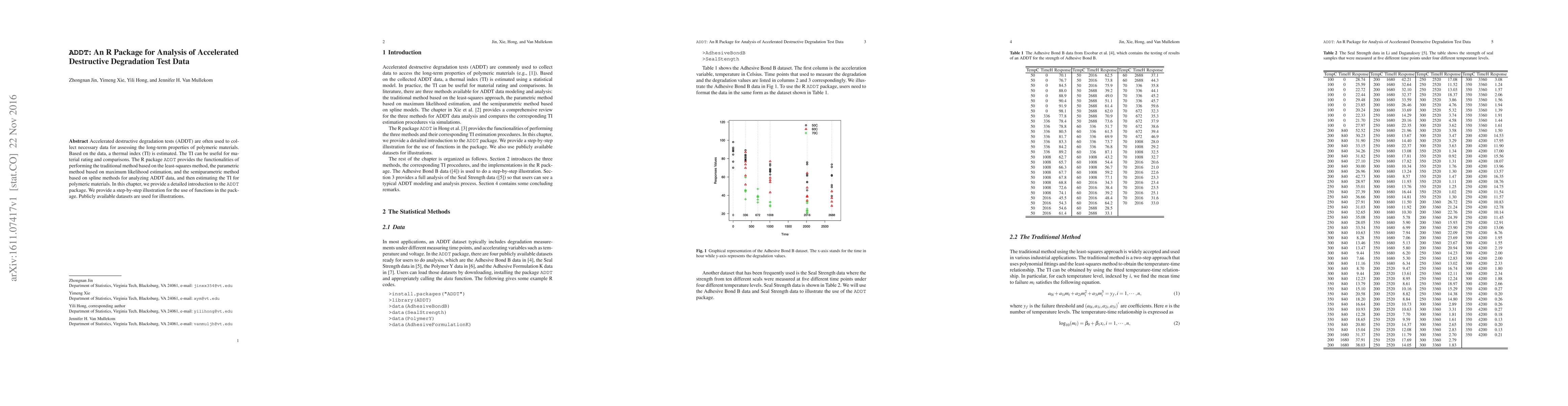 The ADDT R package facilitates analysis of accelerated destructive degradation test data for assessing long-term properties of polymeric materials, offering methods for estimating a thermal index (TI) through least-squares, maximum likelihood, and spline techniques. The paper provides a comprehensive guide and practical examples for utilizing the package's functions.
