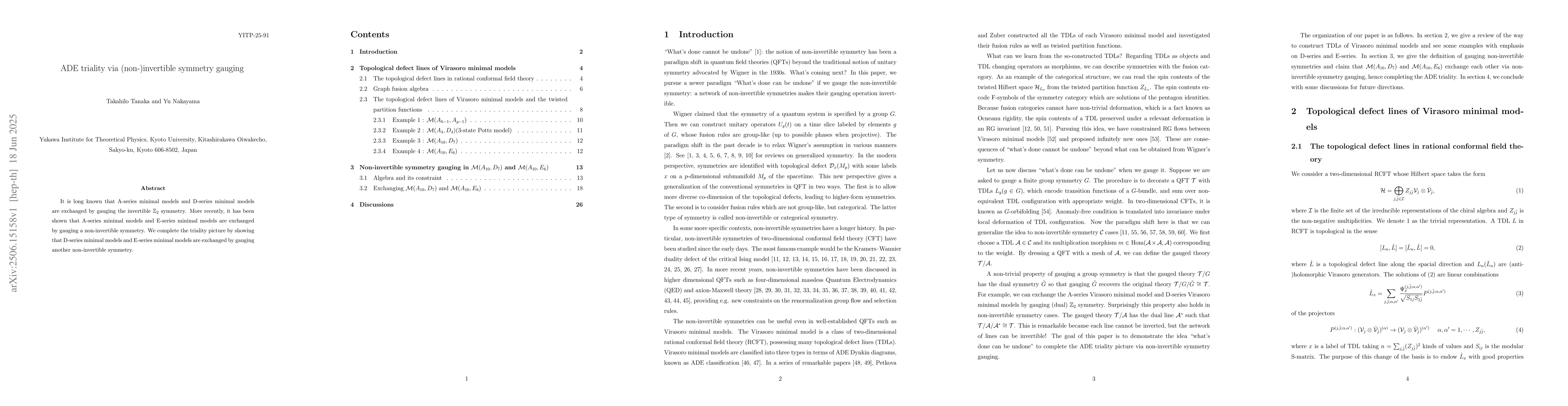 It is long known that A-series minimal models and D-series minimal models are exchanged by gauging the invertible $\mathbb{Z}_2$ symmetry. More recently, it has been shown that A-series minimal models and E-series minimal models are exchanged by gauging a non-invertible symmetry. We complete the triality picture by showing that D-series minimal models and E-series minimal models are exchanged by gauging another non-invertible symmetry.