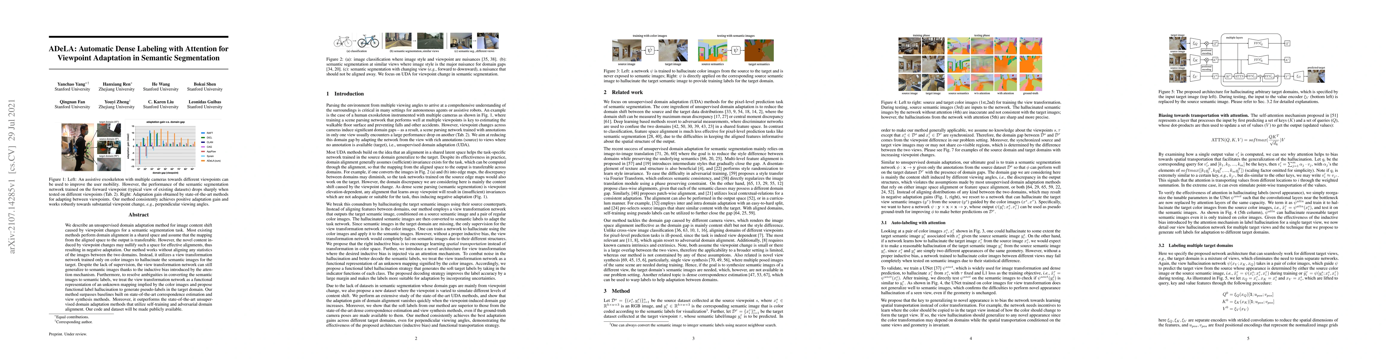 We describe an unsupervised domain adaptation method for image content shift caused by viewpoint changes for a semantic segmentation task. Most existing methods perform domain alignment in a shared space and assume that the mapping from the aligned space to the output is transferable. However, the novel content induced by viewpoint changes may nullify such a space for effective alignments, thus resulting in negative adaptation. Our method works without aligning any statistics of the images between the two domains. Instead, it utilizes a view transformation network trained only on color images to hallucinate the semantic images for the target. Despite the lack of supervision, the view transformation network can still generalize to semantic images thanks to the inductive bias introduced by the attention mechanism. Furthermore, to resolve ambiguities in converting the semantic images to semantic labels, we treat the view transformation network as a functional representation of an unknown mapping implied by the color images and propose functional label hallucination to generate pseudo-labels in the target domain. Our method surpasses baselines built on state-of-the-art correspondence estimation and view synthesis methods. Moreover, it outperforms the state-of-the-art unsupervised domain adaptation methods that utilize self-training and adversarial domain alignment. Our code and dataset will be made publicly available.