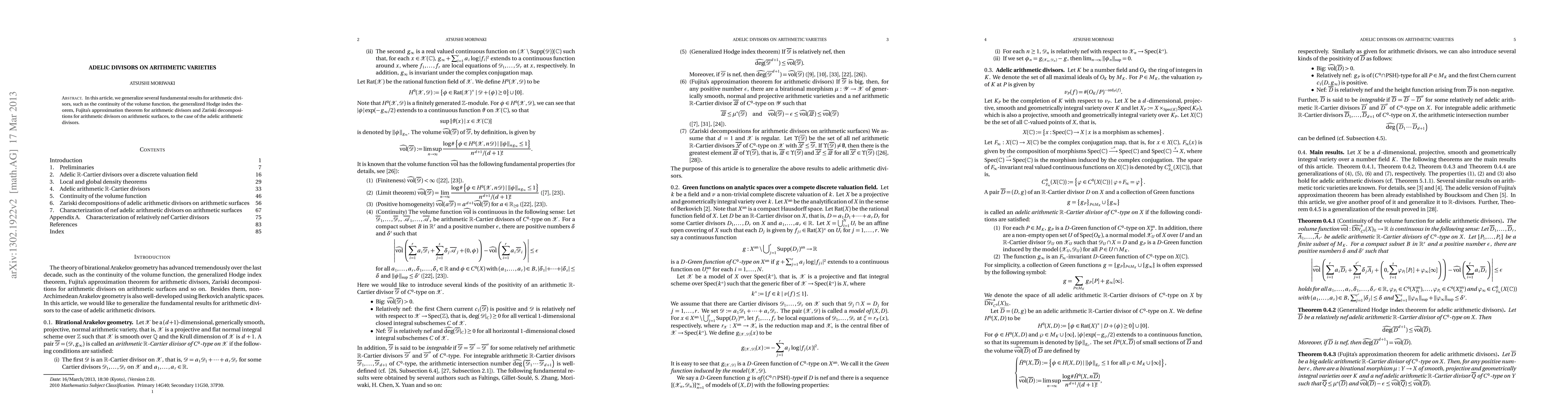 This paper generalizes several key results in arithmetic geometry, including continuity of volume functions, the Hodge index theorem, Fujita's approximation theorem, and Zariski decompositions, to the context of adelic arithmetic divisors on arithmetic varieties. The focus is on extending these foundational theorems to adelic settings.