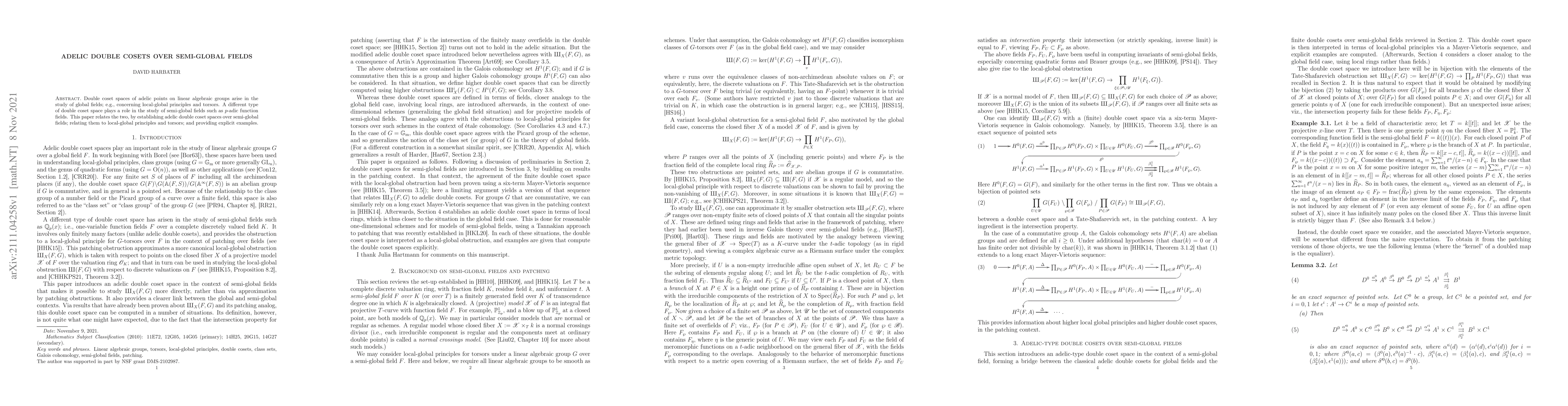 This paper explores adelic double coset spaces over semi-global fields, establishing connections to local-global principles and torsors, and offering explicit examples to illustrate these relationships.