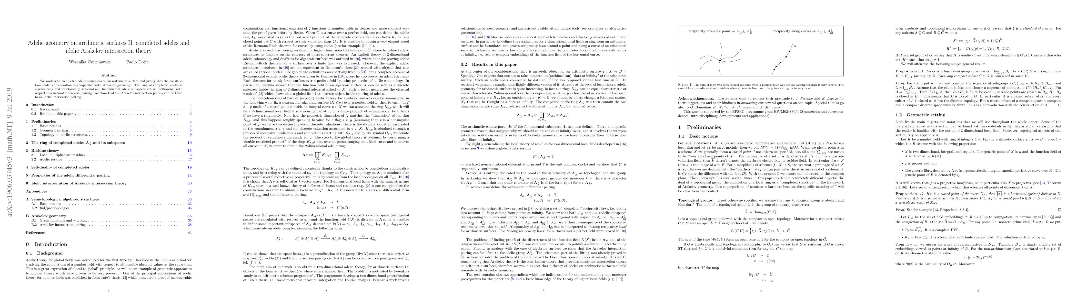 We work with completed adelic structures on an arithmetic surface and justify that the construction under consideration is compatible with Arakelov geometry. The ring of completed adeles is algebraically and topologically self-dual and fundamental adelic subspaces are self orthogonal with respect to a natural differential pairing. We show that the Arakelov intersection pairing can be lifted to an idelic intersection pairing.