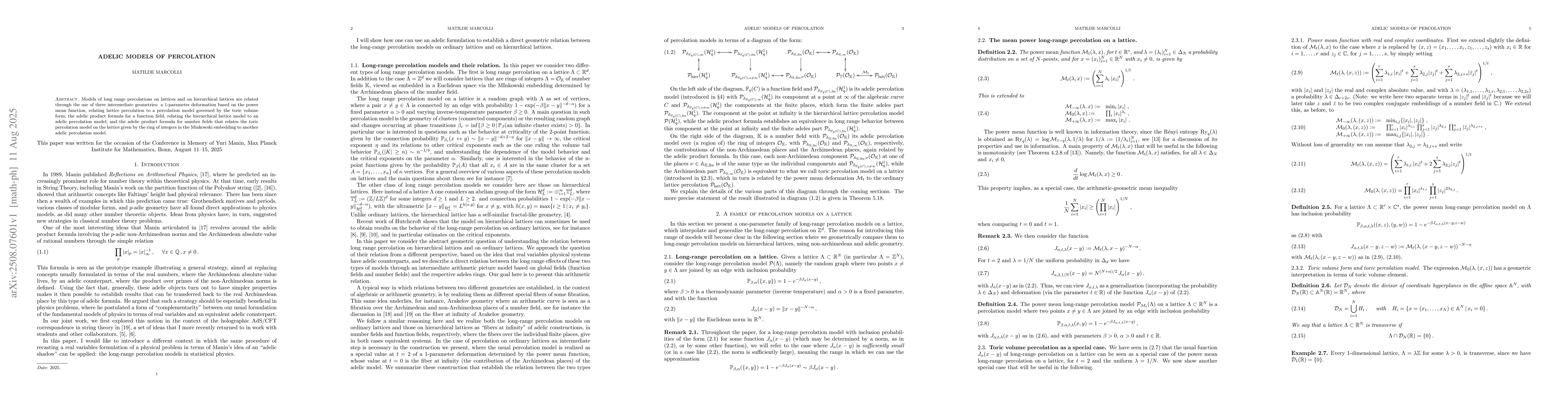 Models of long range percolations on lattices and on hierarchical lattices are related through the use of three intermediate geometries: a 1-parameter deformation based on the power mean function, relating lattice percolation to a percolation model governed by the toric volume form; the adelic product formula for a function field, relating the hierarchical lattice model to an adelic percolation model; and the adelic product formula for number fields that relates the toric percolation model on the lattice given by the ring of integers in the Minkowski embedding to another adelic percolation model.