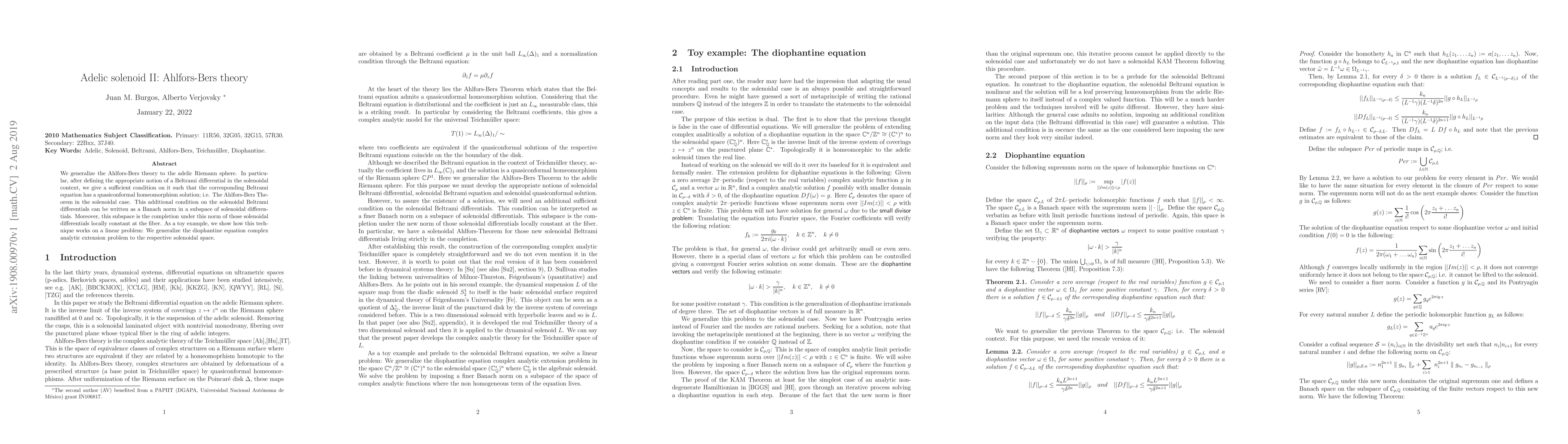We generalize the Ahlfors-Bers theory to the adelic Riemann sphere. In particular, after defining the appropriate notion of a Beltrami differential in the solenoidal context, we give a sufficient condition on it such that the corresponding Beltrami equation has a quasiconformal homeomorphism solution; i.e. The Ahlfors-Bers Theorem in the solenoidal case. This additional condition on the solenoidal Beltrami differentials can be written as a Banach norm in a subspace of solenoidal differentials. Moreover, this subspace is the completion under this norm of those solenoidal differentials locally constant at the fiber. As a toy example, we show how this technique works on a linear problem: We generalize the diophantine equation complex analytic extension problem to the respective solenoidal space.