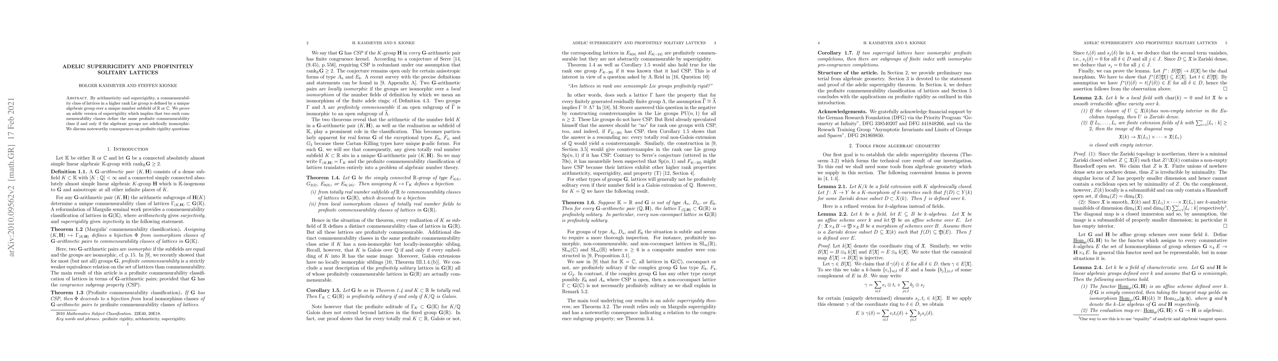 The paper establishes adelic superrigidity for lattices in higher rank Lie groups, showing that commensurability classes are uniquely determined by algebraic groups over specific number subfields, and proves that these classes share the same profinite structure if and only if the underlying algebraic groups are adelically isomorphic. This result has significant implications for profinite rigidity.
