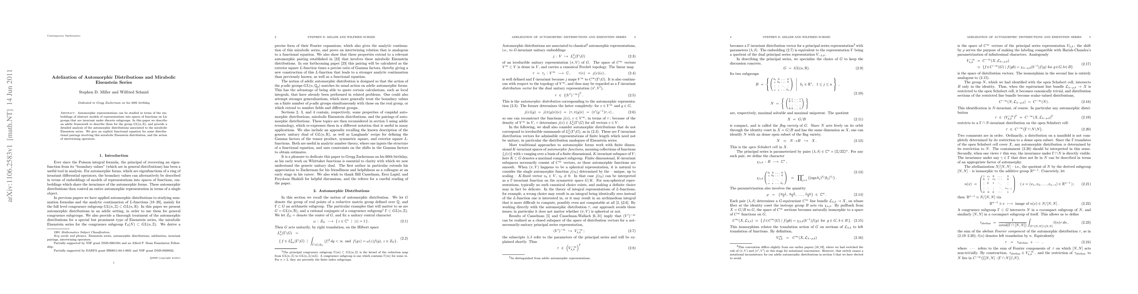 Automorphic representations can be studied in terms of the embeddings of abstract models of representations into spaces of functions on Lie groups that are invariant under discrete subgroups. In this paper we describe an adelic framework to describe them for the group GL(n,R), and provide a detailed analysis of the automorphic distributions associated to the mirabolic Eisenstein series. We give an explicit functional equation for some distributional pairings involving this mirabolic Eisenstein distribution, and the action of intertwining operators.