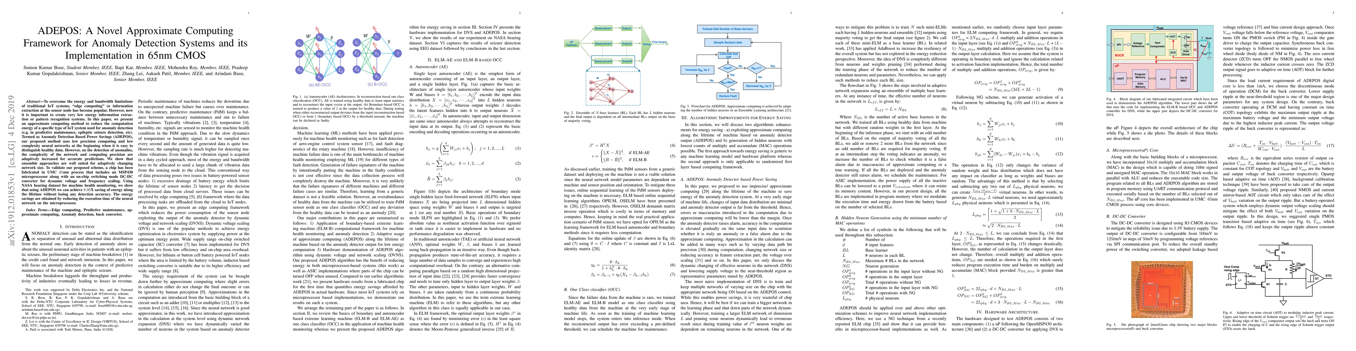 This paper introduces ADEPOS, an approximate computing framework for efficient anomaly detection in IoT systems, which uses low precision computing to save energy. The method adaptively increases network complexity for accurate anomaly detection, validated through a 65nm CMOS chip implementation, achieving significant energy savings without compromising detection accuracy.