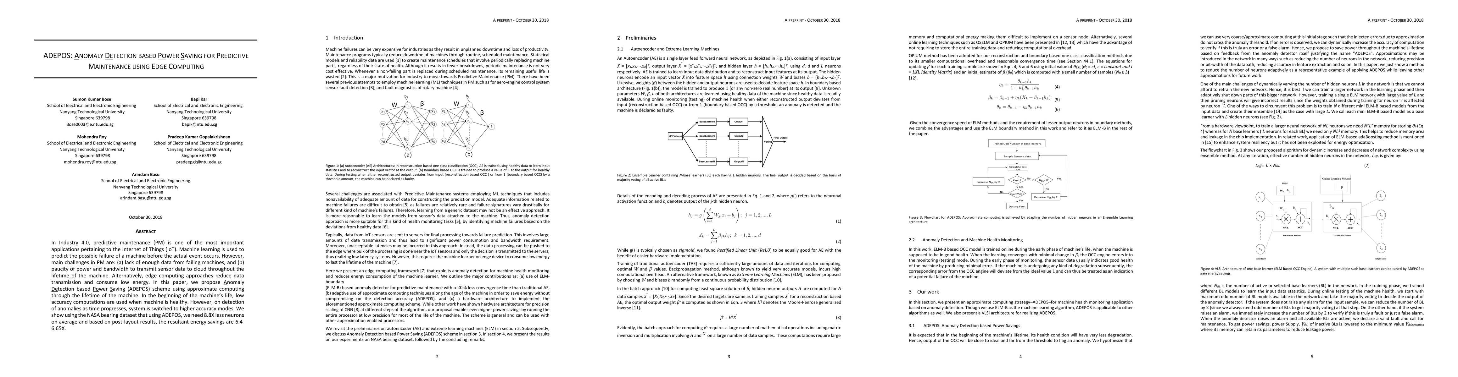 In industry 4.0, predictive maintenance(PM) is one of the most important applications pertaining to the Internet of Things(IoT). Machine learning is used to predict the possible failure of a machine before the actual event occurs. However, the main challenges in PM are (a) lack of enough data from failing machines, and (b) paucity of power and bandwidth to transmit sensor data to cloud throughout the lifetime of the machine. Alternatively, edge computing approaches reduce data transmission and consume low energy. In this paper, we propose Anomaly Detection based Power Saving(ADEPOS) scheme using approximate computing through the lifetime of the machine. In the beginning of the machines life, low accuracy computations are used when the machine is healthy. However, on the detection of anomalies, as time progresses, the system is switched to higher accuracy modes. We show using the NASA bearing dataset that using ADEPOS, we need 8.8X less neurons on average and based on post-layout results, the resultant energy savings are 6.4 to 6.65X