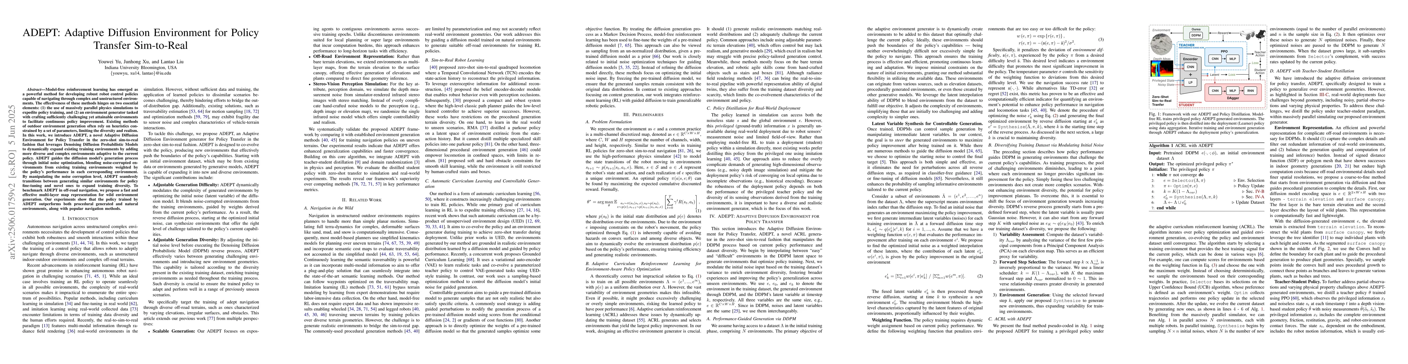 The research introduces ADEPT, an adaptive diffusion environment for policy transfer in sim-to-real navigation, utilizing Denoising Diffusion Probabilistic Models to dynamically expand training environments based on policy performance.