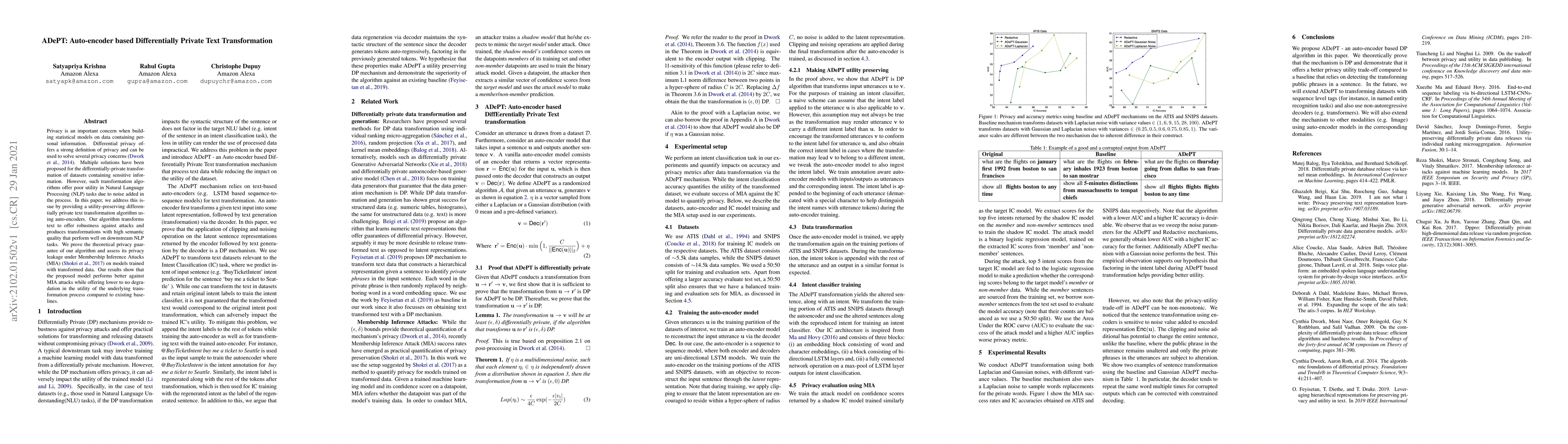 This paper introduces ADePT, an auto-encoder based algorithm for differentially private text transformation that maintains high semantic quality and utility in NLP tasks, while offering robust privacy against Membership Inference Attacks. The algorithm provides theoretical privacy guarantees and demonstrates better performance compared to existing methods.