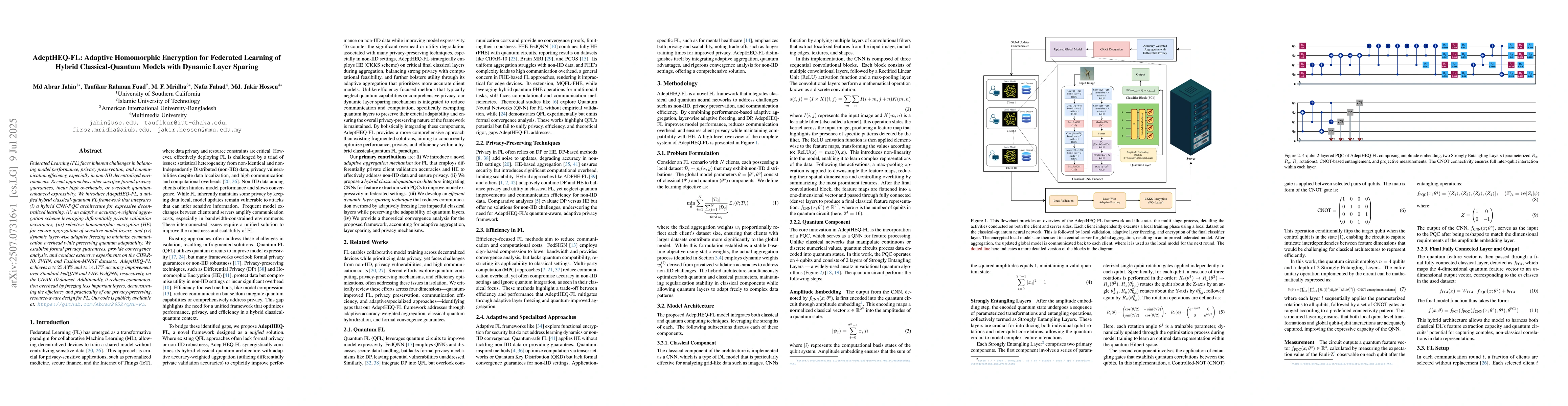 Federated Learning (FL) faces inherent challenges in balancing model performance, privacy preservation, and communication efficiency, especially in non-IID decentralized environments. Recent approaches either sacrifice formal privacy guarantees, incur high overheads, or overlook quantum-enhanced expressivity. We introduce AdeptHEQ-FL, a unified hybrid classical-quantum FL framework that integrates (i) a hybrid CNN-PQC architecture for expressive decentralized learning, (ii) an adaptive accuracy-weighted aggregation scheme leveraging differentially private validation accuracies, (iii) selective homomorphic encryption (HE) for secure aggregation of sensitive model layers, and (iv) dynamic layer-wise adaptive freezing to minimize communication overhead while preserving quantum adaptability. We establish formal privacy guarantees, provide convergence analysis, and conduct extensive experiments on the CIFAR-10, SVHN, and Fashion-MNIST datasets. AdeptHEQ-FL achieves a $\approx 25.43\%$ and $\approx 14.17\%$ accuracy improvement over Standard-FedQNN and FHE-FedQNN, respectively, on the CIFAR-10 dataset. Additionally, it reduces communication overhead by freezing less important layers, demonstrating the efficiency and practicality of our privacy-preserving, resource-aware design for FL.
