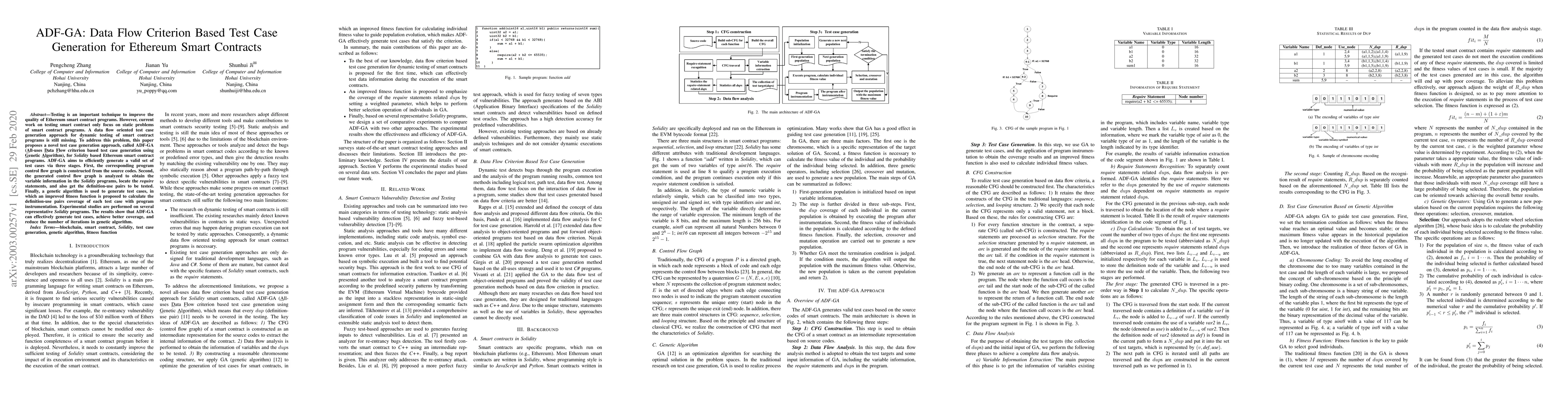 A novel test case generation approach, ADF-GA, is proposed for Ethereum smart contracts to efficiently generate valid test cases via data flow analysis and genetic algorithm, achieving better coverage and reducing iterations.