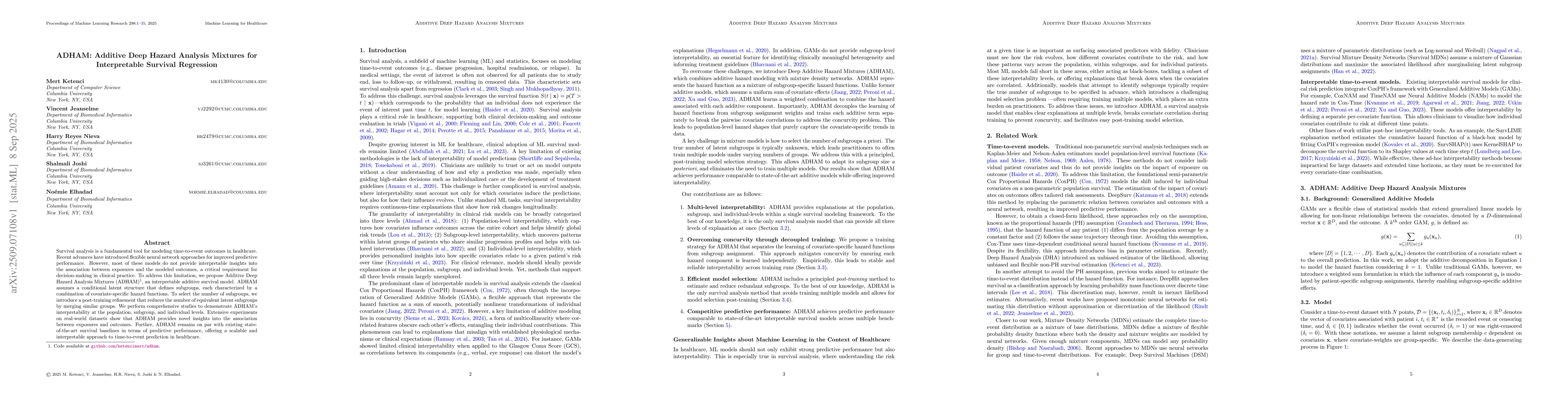 Survival analysis is a fundamental tool for modeling time-to-event outcomes in healthcare. Recent advances have introduced flexible neural network approaches for improved predictive performance. However, most of these models do not provide interpretable insights into the association between exposures and the modeled outcomes, a critical requirement for decision-making in clinical practice. To address this limitation, we propose Additive Deep Hazard Analysis Mixtures (ADHAM), an interpretable additive survival model. ADHAM assumes a conditional latent structure that defines subgroups, each characterized by a combination of covariate-specific hazard functions. To select the number of subgroups, we introduce a post-training refinement that reduces the number of equivalent latent subgroups by merging similar groups. We perform comprehensive studies to demonstrate ADHAM's interpretability at the population, subgroup, and individual levels. Extensive experiments on real-world datasets show that ADHAM provides novel insights into the association between exposures and outcomes. Further, ADHAM remains on par with existing state-of-the-art survival baselines in terms of predictive performance, offering a scalable and interpretable approach to time-to-event prediction in healthcare.