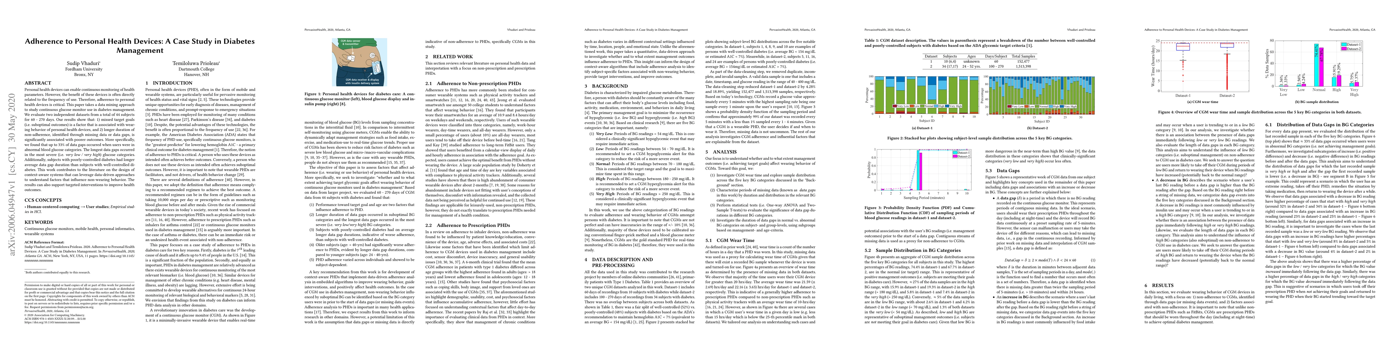 This study examines adherence to continuous glucose monitors in diabetes management using data mining techniques. Findings indicate that missed target goals and longer non-adherence periods correlate with poorer health outcomes, with up to 33% of data gaps occurring in abnormal blood glucose states. The research highlights the need for context-aware systems to address non-wearing behavior and suggests targeted interventions to enhance health outcomes.
