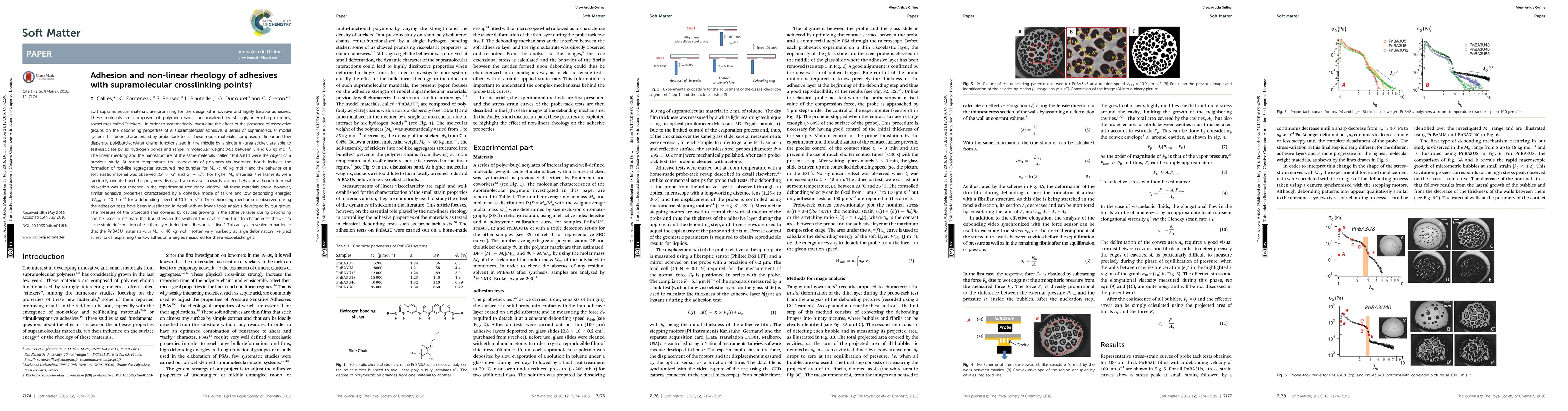 Soft supramolecular materials are promising for the design of innovative and highly tunable adhesives. These materials are composed of polymer chains functionalized by strongly interacting moieties, sometimes called "stickers". In order to systematically investigate the effect of the presence of associative groups on the debonding properties of a supramolecular adhesive, a series of supramolecular model systems has been characterized by probe-tack tests. These model materials, composed of linear and low dispersity poly(butylacrylate) chains functionalized in the middle by a single tri-urea sticker, are able to self-associate by six hydrogen bonds and range in molecular weight (M n) between 5 and 85 kg/mol. The linear rheology and the nanostructure of the same materials (called "PnBA3U") was the object of a previous study 1,2. At room temperature, the association of polymers via hydrogen bonds induces the formation of rod-like aggregates structured into bundles for M n \textless{} 40kg/mol and the behavior of a soft elastic material was observed (G'\textgreater{}\textgreater{}G "and G'~$\omega$ 0). For higher M n , the filaments were randomly oriented and polymers displayed a crossover towards viscous behavior although terminal relaxation was not reached in the experimental frequency window. All these materials show however similar adhesive properties characterized by a cohesive mode of failure and low debonding energies (W adh \textless{}40J/m 2 for a debonding speed of 100$\mu$m/s). The debonding mechanisms observed during the adhesion tests have been investigated in detail with an Image tools analysis developed by our group 3. The measure of the projected area covered by cavities growing in the adhesive layer during debonding can be used to estimate the true stress in the walls of the cavities and thus, to characterize the in-situ large strain deformation of the thin layer during the adhesion test itself. This analysis revealed in particular that the PnBA3U materials with M n \textless{} 40 kg/mol soften very markedly at large deformation like yield stress fluids, explaining the low adhesion energies measured for these viscoelastic gels. 2