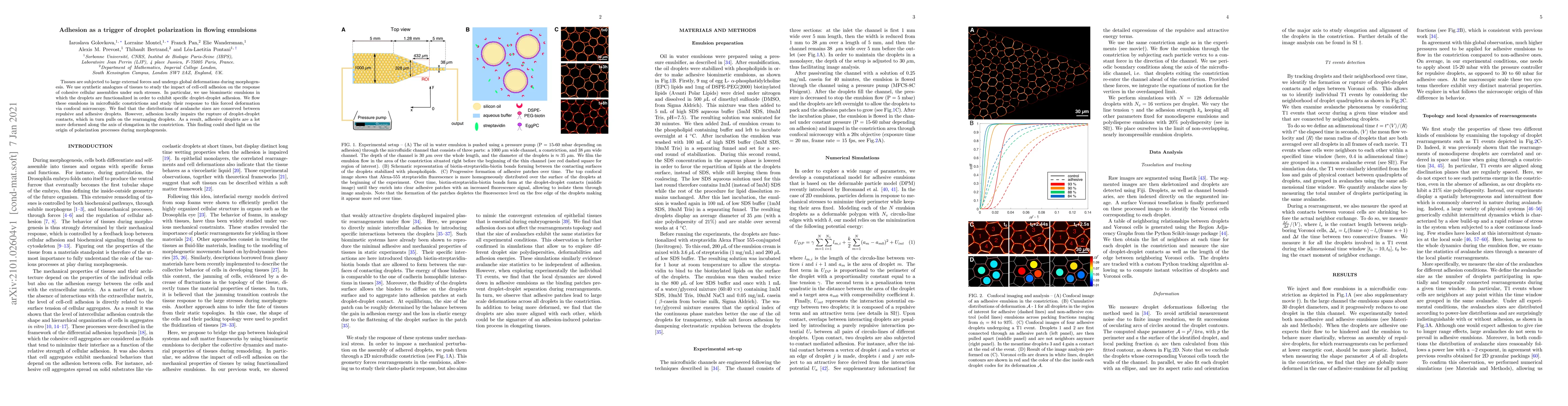 Tissues are subjected to large external forces and undergo global deformations during morphogenesis. We use synthetic analogues of tissues to study the impact of cell-cell adhesion on the response of cohesive cellular assemblies under such stresses. In particular, we use biomimetic emulsions in which the droplets are functionalized in order to exhibit specific droplet-droplet adhesion. We flow these emulsions in microfluidic constrictions and study their response to this forced deformation via confocal microscopy. We find that the distributions of avalanche sizes are conserved between repulsive and adhesive droplets. However, adhesion locally impairs the rupture of droplet-droplet contacts, which in turn pulls on the rearranging droplets. As a result, adhesive droplets are a lot more deformed along the axis of elongation in the constriction. This finding could shed light on the origin of polarization processes during morphogenesis.