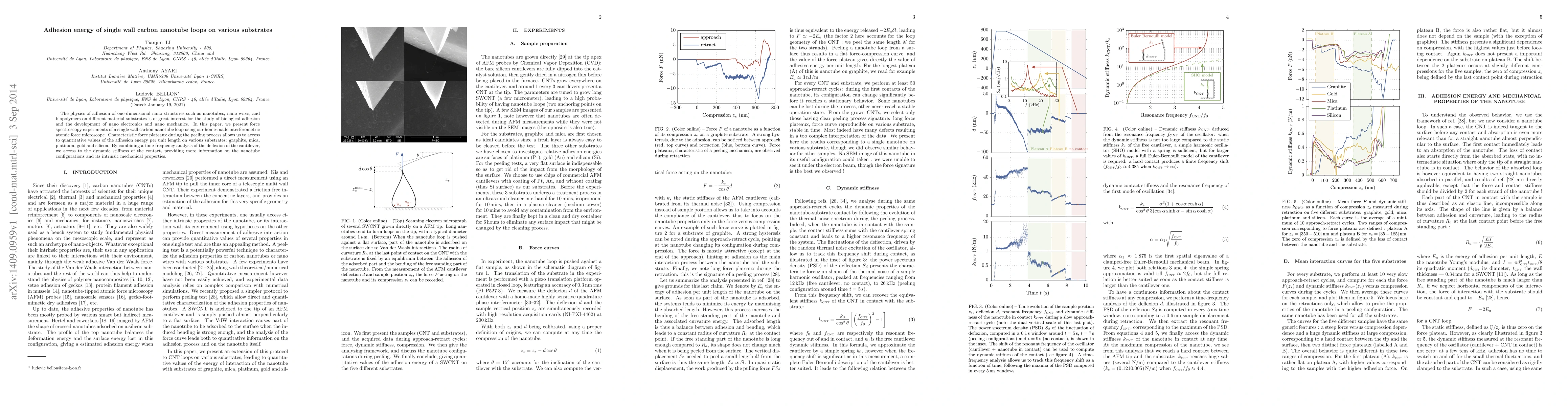The physics of adhesion of one-dimensional nano structures such as nanotubes, nano wires, and biopolymers on different material substrates is of great interest for the study of biological adhesion and the development of nano electronics and nano mechanics. In this paper, we present force spectroscopy experiments of a single wall carbon nanotube loop using our home-made interferometric atomic force microscope. Characteristic force plateaux during the peeling process allows us to access to quantitative values of the adhesion energy per unit length on various substrates: graphite, mica, platinum, gold and silicon. By combining a time-frequency analysis of the deflexion of the cantilever, we access to the dynamic stiffness of the contact, providing more information on the nanotube configurations and its intrinsic mechanical properties.