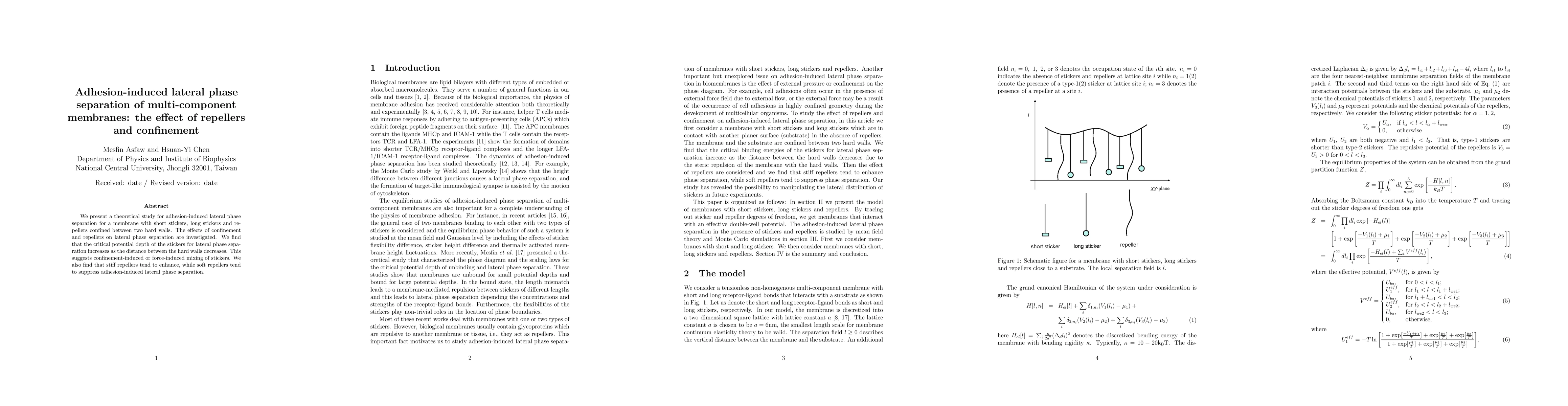 This study investigates adhesion-induced lateral phase separation in multi-component membranes with varying sticker lengths and repellers, confined between two walls. The research finds that confinement increases the critical potential depth for phase separation, indicating force-induced mixing, while the effect of repellers depends on their stiffness, with stiff repellers enhancing and soft repellers suppressing phase separation.
