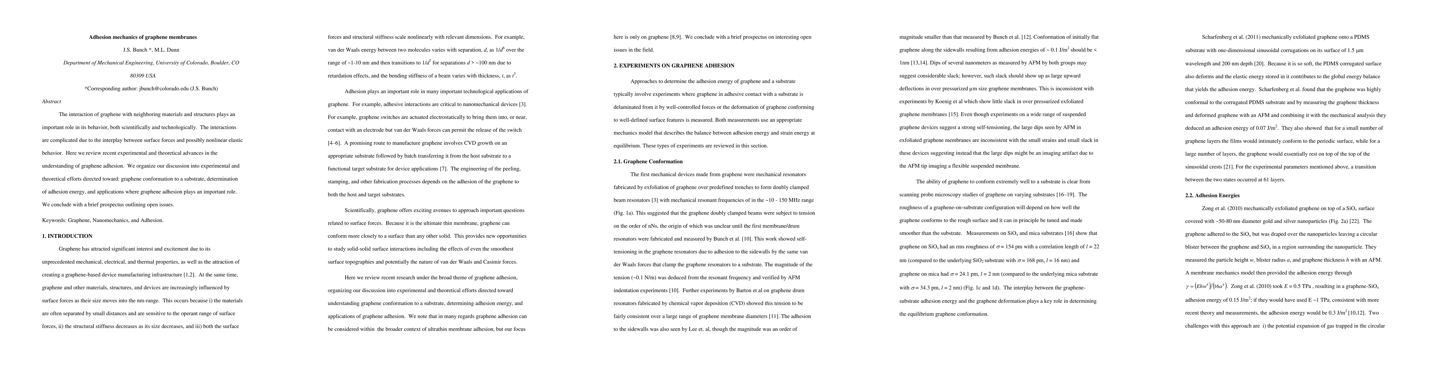 This paper reviews recent advances in understanding the adhesion mechanics of graphene, focusing on experimental and theoretical studies of graphene's interaction with substrates, determination of adhesion energy, and its technological applications. The paper concludes with a discussion of remaining open issues in the field.