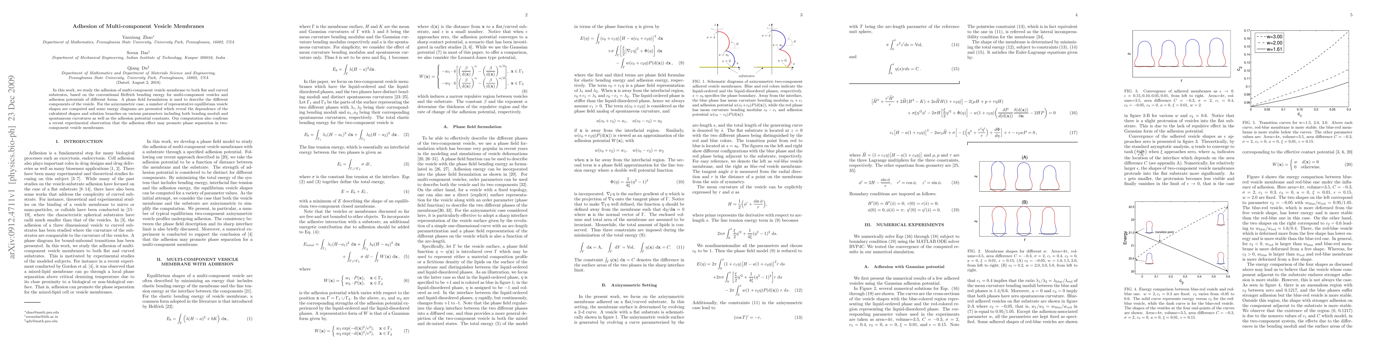 This paper investigates the adhesion of multi-component vesicle membranes to various substrates using a phase field formulation and Helfrich bending energy. It reveals how different parameters influence vesicle shapes and confirms experimental observations of phase separation due to adhesion effects.
