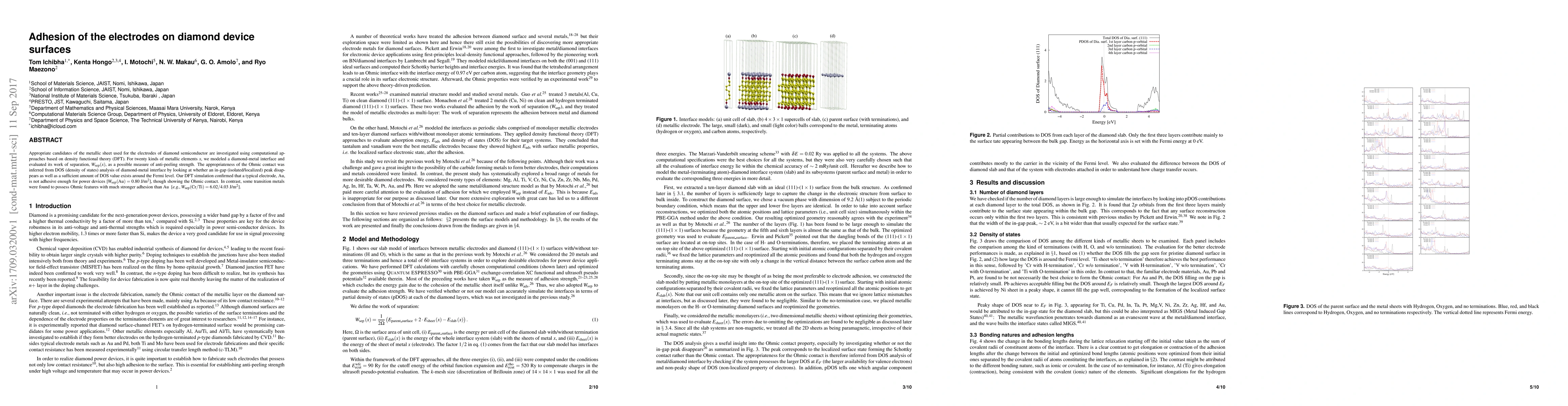 Researchers used computational approaches to investigate the adhesion of electrodes on diamond device surfaces, finding that some transition metals like Cr/Ti have stronger adhesion than Au.