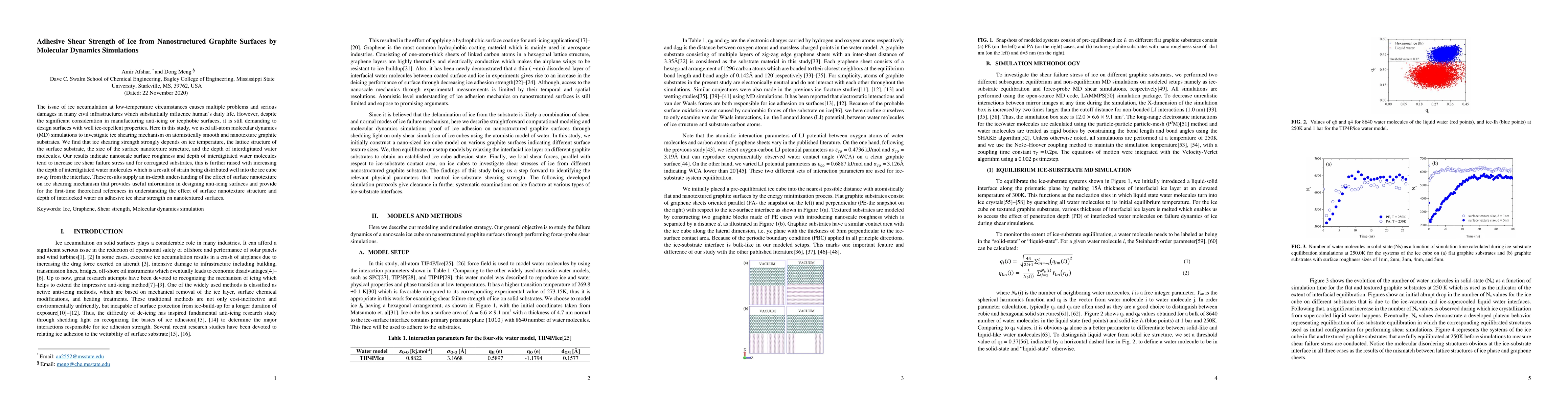 Researchers used molecular dynamics simulations to study ice shear strength on nanotextured graphite surfaces, finding that surface roughness and water molecule depth can increase ice shear failure stress.