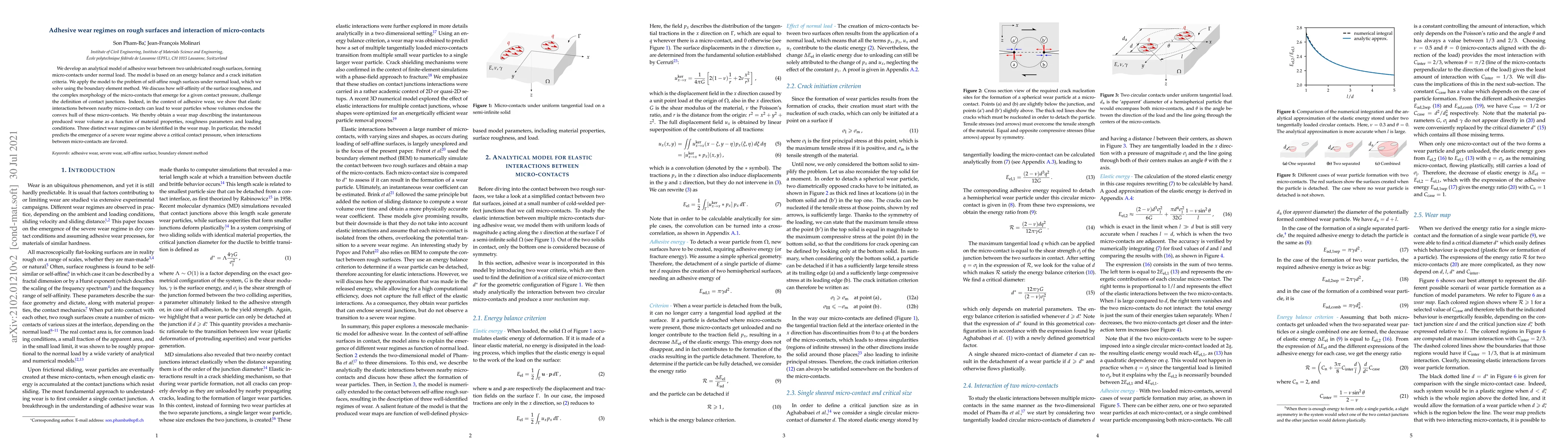 This paper develops an analytical model to describe adhesive wear between unlubricated rough surfaces, identifying three distinct wear regimes based on energy balance and crack initiation criteria. The model predicts severe wear above a critical contact pressure due to interactions between micro-contacts, leading to a wear map that correlates wear volume with material properties, roughness, and loading conditions.