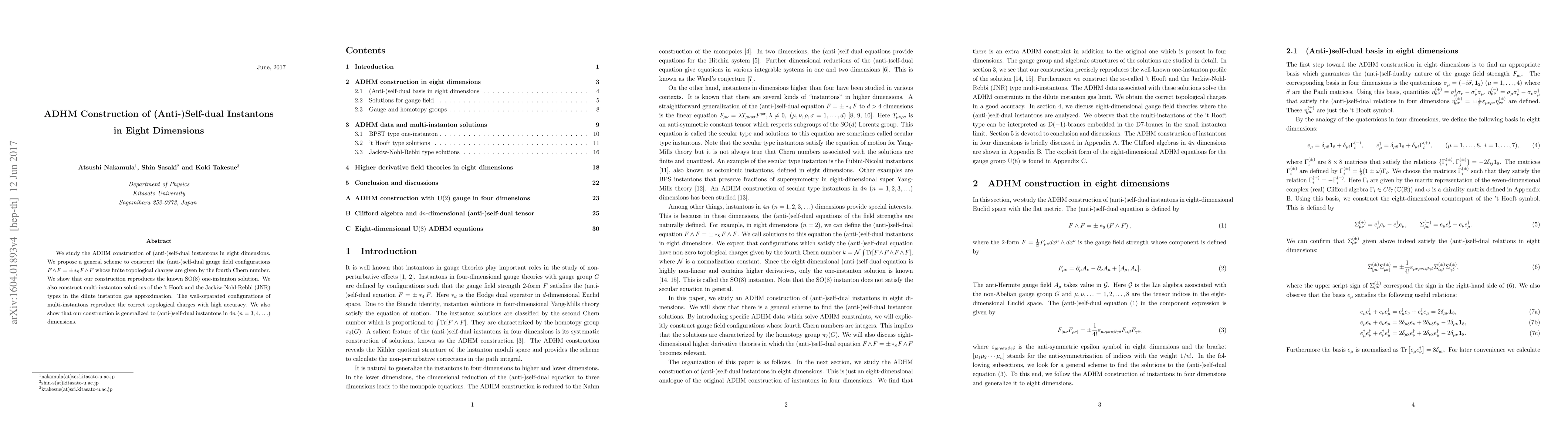 This paper proposes a general scheme for constructing (anti-)self-dual instantons in eight and higher dimensions using the ADHM construction, demonstrating it reproduces known solutions and extends to multi-instanton configurations with accurate topological charges.
