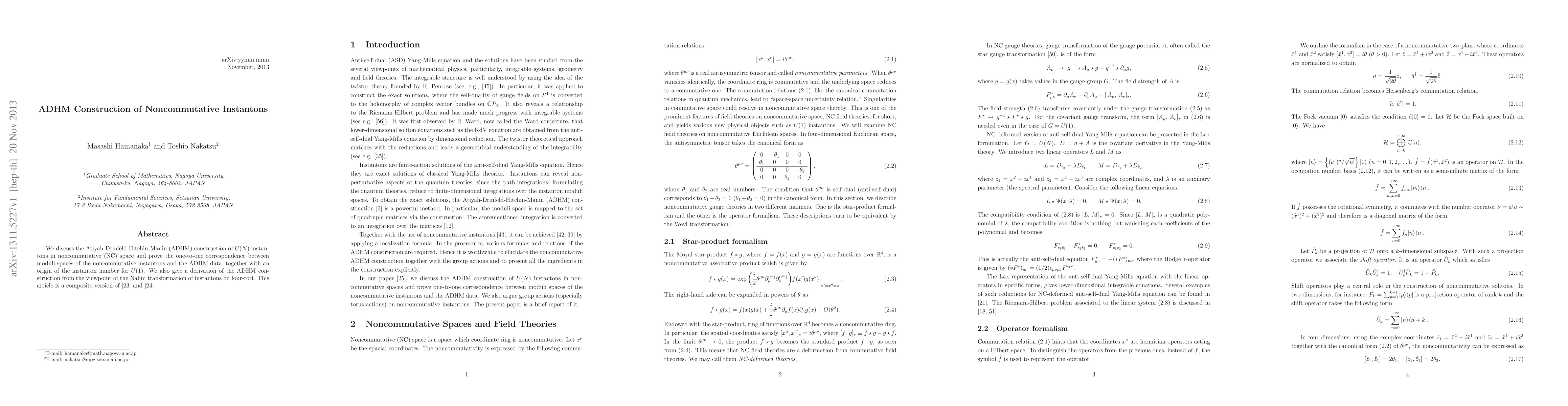 The paper presents the Atiyah-Drinfeld-Hitchin-Manin (ADHM) construction for U(N) instantons in noncommutative space, proving a one-to-one correspondence between noncommutative instanton moduli spaces and ADHM data, and derives this construction via Nahm transformations on four-tori. It combines results from two prior studies.